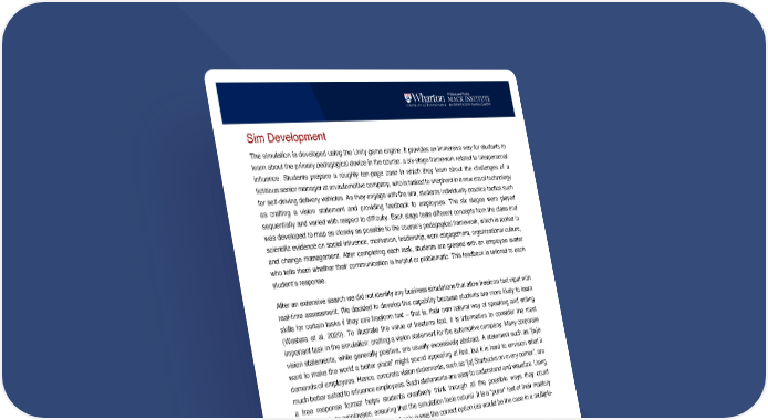 3 Sim Development The simulation is developed using the Unity game engine. It provides an immersive way for students to learn about the primary pedagogical device in the course: a six-stage framework related to interpersonal influence. Students prepare a roughly ten-page case in which they learn about the challenges of a fictitious senior manager at an automotive company, who is tasked to shepherd in a new era of technology for self-driving delivery vehicles. As they engage with the sim, students individually practice tactics such as crafting a vision statement and providing feedback to employees. The six stages were played sequentially and varied with respect to difficulty. Each stage tests different concepts from the class and was developed to map as closely as possible to the course’s pedagogical framework, which is rooted in scientific evidence on social influence, motivation, leadership, work engagement, organizational culture, and change management. After completing each task, students are greeted with an employee avatar who tells them whether their communication is helpful or problematic. This feedback is tailored to each student’s response. After an extensive search we did not identify any business simulations that allow freeform text input with real-time assessment. We decided to develop this capability because students are more likely to learn skills for certain tasks if they use freeform text – that is, their own natural way of speaking and writing (Westera et al. 2020). To illustrate the value of freeform text, it is informative to consider the most important task in the simulation: crafting a vision statement for the automotive company. Many corporate vision statements, while generally positive, are usually excessively abstract. A statement such as “[w]e want to make the world a better place” might sound appealing at first, but it is hard to envision what it demands of employees. Hence, concrete vision statements, such as “[a] Starbucks on every corner”, are much better suited to influence employees. Such statements are easy to understand and visualize. Using a free response format helps students creatively think through all the possible ways they could communicate to employees, ensuring that the simulation feels natural. It is a “purer” test of their mastery of the material, because they cannot simply guess the correct option (as would be the case in a multiple- choice format). To continue the example above, students will only get a high score if they devise a highly concrete vision for the automotive company entirely on their own. A vision such as “a city full of hybrid cars” will get a higher score than “building a more a sustainable world”, because the former statement is more concrete than the latter statement. In the context of our sim, a higher score means that a student’s vision has successfully inspired a greater number of employees. Figure 1a displays the user interface that students see when they are asked to generate a vision, and Figure 1b displays an example of a response to a student-generated vision. We designed many different employee responses so students would receive feedback tailored to the strengths and weaknesses of the vision they generated, as determined by the trained LLM. Some students might receive feedback from an employee avatar about how the vision they just generated is too long, vague, or complicated. Other students might be told that their vision is inspiring
