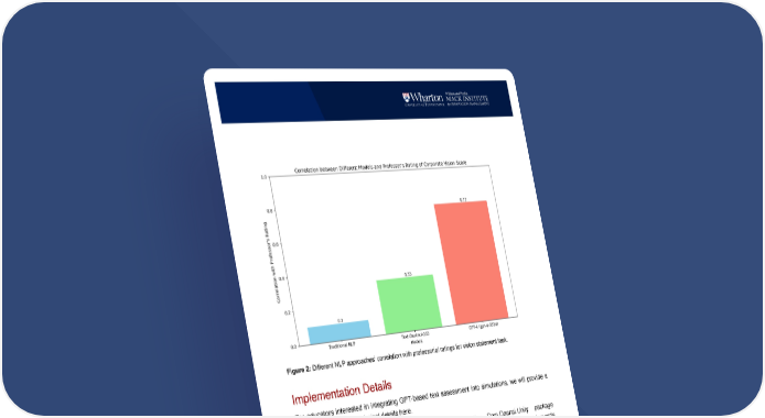 9 Figure 2: Different NLP approaches’ correlation with professorial ratings for vision statement task. Implementation Details For educators interested in integrating GPT-based text assessment into simulations, we will provide a few observations and technical details here. Our simulation is developed in Unity and we use the Com.Openai.Unity package (“RageAgainstThePixel/Com.Openai.Unity” 2024) to make API calls to OpenAI. A small proxy forwards the front-end requests coming from our Unity WebGL app to prevent the API keys from being visible. The student input is appended to the prompt to serve as the “vision input” to grade. For all requests, the temperature6 was set to 0 to ensure that we get the most consistent responses. However, we would still 6 The temperature affects the randomness of the token selection during text generation. A temperature of 0 greatly restricts the model's output, ideally limiting it to the most likely token at each step, which generally results in very deterministic and repetitive outputs. However, even with a temperature of 0, minor variations in output can still occur due to other factors in the model's architecture and implementation.