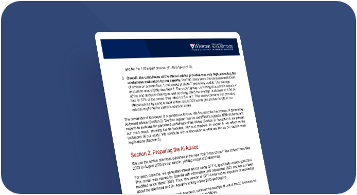 3 and for the 110 expert choices (61:49 in favor of AI). 3. Overall, the usefulness of the ethical advice provided was very high, including the usefulness evaluation by our experts. We had raters score the perceived usefulness of advice on a scale from 1 (not useful at all) to 7 (extremely useful). The average evaluation was slightly less than 5. The expert group, consisting of academic experts in ethics and decision-making as well as clergy rated the average usefulness at 4.94. In fact, in 37% of the cases, they rated it a 6 or a 7. This eases concerns that providing ethical advice by using a short written text of 323 words (the median length of our advice) might not be useful in absolute terms. The remainder of this paper is organized as follows. We first describe the process of generating AI-based advice (Section 2). We then explain how we used Prolific subjects, MBA students, and experts to evaluate the perceived usefulness of the advice (Section 3). In section 4, we present our main result, showing the tie between man and machine. In section 5, we reflect on the limitations of our study. We conclude with a discussion of what we see as our study’s main implications (Section 6). Section 2: Preparing the AI Advice We use the ethical dilemmas published in the New York Times column “The Ethicist” from May 2023 to August 2023 as our sample, yielding a total of 20 dilemmas. For each dilemma, we generated ethical advice using GPT-4, specifically version gpt4-0314. This model was trained by OpenAI with information until September 2021 and has not been modified since March 2023. Thus, this version of GPT-4 has had no exposure or knowledge about the dilemmas and Dr. Appiah’s writing in May 2023 and beyond. To further illustrate the research approach, consider the example of one of the 20 dilemmas we studied. The dilemma expressed by the reader is as follows. Ethical Dilemma I am a 44-year-old man and have been married to my spouse for 10 years. We’ve been together for 15. Unbeknown to my spouse, I have a trust fund that provides me with a monthly income of $25,000. When we first met, I said that I worked as a consultant, and they have never questioned this. My spouse, a dedicated doctor, works long hours and doesn’t like to discuss work when not on the job. Over the years, I’ve repeatedly assured my spouse that they don’t need to work, as my income is secure and stable. They are, however, passionate about their career and have chosen to continue working. I actively serve on various boards, but I have never