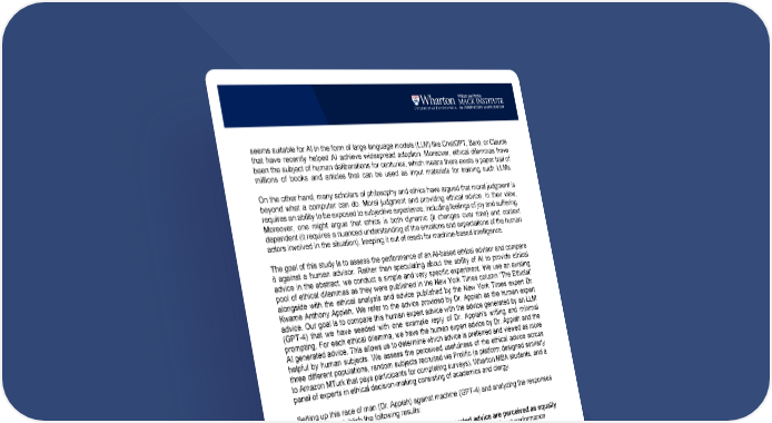 2 seems suitable for AI in the form of large language models (LLM) like ChatGPT, Bard, or Claude that have recently helped AI achieve widespread adoption. Moreover, ethical dilemmas have been the subject of human deliberations for centuries, which means there exists a paper trail of millions of books and articles that can be used as input materials for training such LLMs. On the other hand, many scholars of philosophy and ethics have argued that moral judgment is beyond what a computer can do. Moral judgment and providing ethical advice, in their view, requires an ability to be exposed to subjective experience, including feelings of joy and suffering. Moreover, one might argue that ethics is both dynamic (it changes over time) and context dependent (it requires a nuanced understanding of the emotions and expectations of the human actors involved in the situation), keeping it out of reach for machine-based intelligence. The goal of this study is to assess the performance of an AI-based ethical advisor and compare it against a human advisor. Rather than speculating about the ability of AI to provide ethical advice in the abstract, we conduct a simple and very specific experiment. We use an existing pool of ethical dilemmas as they were published in the New York Times column “The Ethicist” alongside with the ethical analysis and advice published by the New York Times expert Dr. Kwame Anthony Appiah. We refer to the advice provided by Dr. Appiah as the human expert advice. Our goal is to compare this human expert advice with the advice generated by an LLM (GPT-4) that we have seeded with one example reply of Dr. Appiah’s writing and minimal prompting. For each ethical dilemma, we have the human expert advice by Dr. Appiah and the AI generated advice. This allows us to determine which advice is preferred and viewed as more helpful by human subjects. We assess the perceived usefulness of the ethical advice across three different populations, random subjects recruited via Prolific (a platform designed similarly to Amazon MTurk that pays participants for completing surveys), Wharton MBA students, and a panel of experts in ethical decision-making consisting of academics and clergy. Setting up this race of man (Dr. Appiah) against machine (GPT-4) and analyzing the responses allows us to establish the following results: 1. Human generated ethical advice and AI generated advice are perceived as equally useful. On average, across all dilemmas, we did not find a significant performance advantage of the human expert despite substantial statistical power in our tests. Specifically, subjects on Prolific, Wharton MBA students, and experts find the advice generated by GPT-4 to be as useful as the advice generated by the human expert, Dr. Appiah. 2. When given the choice, laypersons slightly seem to favor the AI generated advice while MBA students and experts have no preference between the human generated advice and the AI generated advice. When we force subjects to pick between the human and the AI generated advice, subjects recruited via Prolific picked the AI generated evidence 311 out of 517 times (60.15%), which is strongly significant. We did not find significant differences for the 251 MBA choices (135:128 in favor of AI)