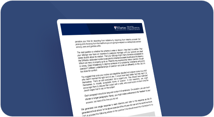 5 penalize your kids for departing from Halakha by departing from Halakha yourself. But picking and choosing from the traditions you are going to respect is a widespread practice among Jews and gentiles alike. The real question is whether the scheme is wise or decent. I fear that it is neither. That your siblings now have an incentive to postpone marriage until your parents are dead raises doubts about its wisdom. That your siblings might marry someone acceptable to the Orthodox rabbinate in order to secure this inheritance raises doubts about its decency. Whom we marry is properly up to us. Parents may express their views; coercion, though, is wrong. Does threatening to deprive someone of a substantial inheritance amount to coercion? Different understandings of coercion will come out differently on this. But it’s too close for comfort. You suggest that once your mother and stepfather decided not to leave money to a child who hadn’t married the right kind of Jew, it would have been better had they kept it to themselves. That’s an odd conclusion, but a cogent one: They should have restricted themselves to morally acceptable forms of suasion. In the meantime, you might encourage them to discuss their codicil with a rabbi, who could explain to them what the Jewish sages had to say on the subject. Each paragraph should be long and contain 6-8 sentences. On occasion, you use much shorter or longer paragraphs. Rarely, you might make a reference to the "readers" of your answers, but most of the time you do not. We generated one single response to each dilemma and refer to this response as the AI- generated ethical advice. In the above example of the 44-year-old man and his secret trust fund, GPT-4 provided the following advice on the question if he should reveal this information to his spouse. GPT Example Reply This situation indeed poses an ethical quandary, one that swirls around issues concerning honesty, perceived deception, and financial disclosure in a marital relationship. Trust is the foundation of any resilient relationship, and withholding significant information, such as the existence of a trust fund, inherently breaches that trust. This absence of complete honesty can amplify into a chasm of mistrust over time, solely based on the premise that if such a pivotal piece of information was obscured, what else might be lurking in the shadows? Examining the ethical dimension from a different perspective, it's essential to note that money, as we are often reminded, does not buy happiness nor love. Defending your decision to withhold information about the trust fund, one might argue that you feared your monetary assets would tint the pureness of a relationship