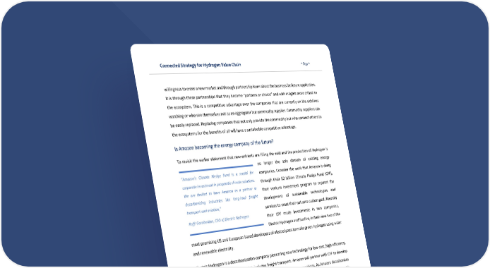 Connected Strategy for Hydrogen Value Chain ^ Top ^ 52 willingness to enter a new market and through partnership learn about the business for future application. It is through these partnerships that they become “partners or choice” and with insights more critical to the ecosystem. This is a competitive advantage over the companies that are currently on the sidelines watching or who see themselves not as an aggregator but commodity supplier. Commodity suppliers can be easily replaced. Replacing companies that not only provide the commodity but who connect others to the ecosystems for the benefits of all will have a sustainable competitive advantage. Is Amazon becoming the energy company of the future? To revisit the earlier statement that new entrants are filling the void and the production of Hydrogen is no longer the sole domain of existing energy companies. Consider the work that Amazon is doing through their $2 billion Climate Pledge Fund (CPF), their venture investment program to support the development of sustainable technologies and services to meet their net-zero carbon goal. Recently their CPF made investments in two companies, Electric Hydrogen and Sunfire, in their view two of the most promising US and European based developers of electrolyzers to make green hydrogen using water and renewable electricity. Electric Hydrogen is a decarbonization company pioneering new technology for low-cost, high-efficiency, renewable hydrogen systems which includes freight transport. Amazon will partner with CPF to develop a hydrogen solution that supports their vision to decarbonize their operations. As Amazon decarbonizes its fleet through green Hydrogen (through many partnerships) they will intelligently learn and possibly acquire the company. As they build out their capability, they will also reach a point where they have the capacity of to supply at a volume greater than its internal demand. At some point it transitions to being a consumer to consumer of Hydrogen and provider of solutions to others. When this is combined with its existing partnerships and insights from its own ecosystem, companies such as Amazon will pose a significant threat to the Energy and utility companies that exist today. “Amazon's Climate Pledge Fund is a model for corporate investment in pragmatic climate solutions. We are thrilled to have Amazon as a partner in decarbonizing industries like long-haul freight transport and aviation,” Raffi Garabedian, CEO of Electric Hydrogen