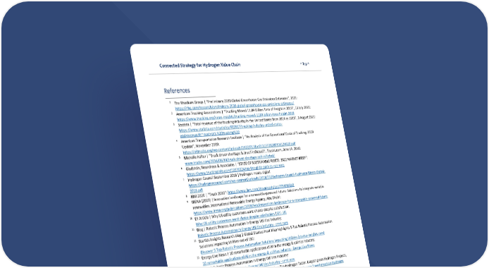 Connected Strategy for Hydrogen Value Chain ^ Top ^ 58 References 1 The Rhodium Group | “Preliminary 2020 Global Greenhouse Gas Emissions Estimates”, 2021: https://rhg.com/research/preliminary-2020-global-greenhouse-gas-emissions-estimates/ 2 American Trucking Associations | “Trucking Moved 11.84 Billion Tons of Freight in 2019”, 13 July 2020: https://www.trucking.org/news-insights/trucking-moved-1184-billion-tons-freight-2019 3 Statista | “Total revenue of the trucking industry in the United States from 2014 to 2019”, 3 August 2021: https://www.statista.com/statistics/922817/trucking-industry-united-states- otalrevenue/#:~:text=U.S.%20trucking%20 4 American Transportation Research Institute | “An Analysis of the Operational Costs of Trucking: 2019 Update”, November 2019: https://aktrucks.org/wp-content/uploads/2020/01/doc01315520200106124920.pdf 5 Michelle Rafter | “Truck driver shortage: Is it self-inflicted?”, Trucks.com, June 14, 2016: www.trucks.com/2016/06/14/truck-driver-shortage-self-inflicted/ 6 Gladstein, Neandross & Associates | “STATE OF SUSTAINABLE FLEETS: 2022 MARKET BRIEF”: https://www.truckinginfo.com/10170224/on-the-glide-path-to-net-zero 7 Hydrogen Council September 2018 | Hydrogen meets digital https://hydrogencouncil.com/wp-content/uploads/2018/10/Hydrogen-Council-Hydrogen-Meets-Digital- 2018.pdf 8 IBM 2020 | “Truck 2030”: https://www.ibm.com/downloads/cas/7PVEWQLD 9 IRENA (2019) | Innovation landscape for a renewable-powered future: Solutions to integrate variable renewables. International Renewable Energy Agency, Abu Dhabi: https://www.irena.org/publications/2019/Feb/Innovation-landscape-for-a-renewable-powered-future 10 EY Article | Why US utility customers want choice despite satisfaction: Why US utility customers want choice despite satisfaction | EY - US 11 Blog | Robotic Process Automation in Energy Utilities Industry: Robotic Process Automation in Energy Utilities Industry - crmt.com 12 StartUs Insights Research blog | Global Startup Heat Map highlights 5 Top Robotic Process Automation Solutions impacting Utilities out of 181: Discover 5 Top Robotic Process Automation Solutions impacting Utilities (startus-insights.com) 13 Energy Live News | 10 remarkable applications of AI in the energy & utilities industry: 10 remarkable applications of AI in the energy & utilities industry - Energy Live News 14 Blog | Robotic Process Automation in Energy Utilities Industry: Robotic Process Automation in Energy Utilities Industry - crmt.com 15 IRENA | The geopolitics of the energy transformation: The Hydrogen factor. Largest green Hydrogen Projects, 2021: https://www.irena.org/publications/2022/Jan/Geopolitics-of-the-Energy-Transformation-Hydrogen 16 Ibredrola | Press Release. Company news - Iberdrola 17 Deloitte | A blueprint for a green workforce transformation: https://www2.deloitte.com/content/dam/Deloitte/uk/Documents/consultancy/deloitte-uk-a-blueprint-for- green-workforce-transformation.pdf 18 World Economic Forum | Future of Jobs report. 2020: https://www.weforum.org/reports/the-future-of-jobs-report-2020/ 19 Deloitte Insights | The decarbonized power workforce. Digital and Diverse, 2021: https://www2.deloitte.com/us/en/insights/industry/power-and-utilities/decarbonization-strategy-power- workforce.html 20 Center for Energy Workforce Development | 2021 Pipeline survey report: https://cewd.org/about/2021-gaps-in-the-energy-workforce-pipeline-survey-results/ 21 Smith. Success rates for different types of organizational change, 2002: https://onlinelibrary-wiley-com.proxy.library.upenn.edu/doi/epdf/10.1002/pfi.4140410107
