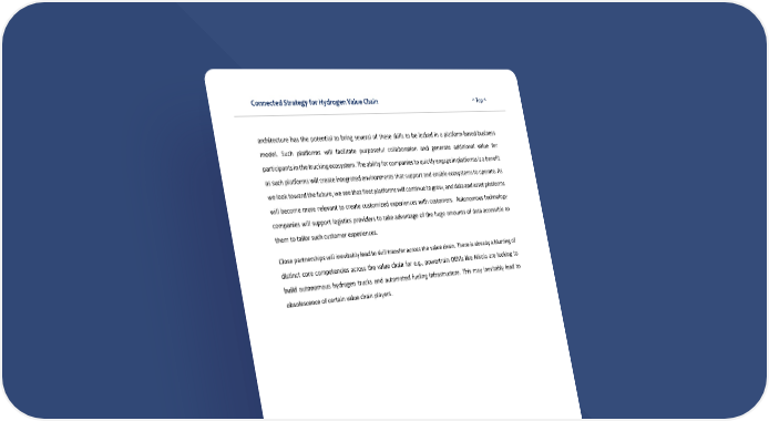 Connected Strategy for Hydrogen Value Chain ^ Top ^ 26 architecture has the potential to bring several of these skills to be locked in a platform-based business model. Such platforms will facilitate purposeful collaboration and generate additional value for participants in the trucking ecosystem. The ability for companies to quickly engage in platforms is a benefit as such platforms will create integrated environments that support and enable ecosystems to operate. As we look toward the future, we see that fleet platforms will continue to grow, and data and asset platforms will become more relevant to create customized experiences with customers. Autonomous technology companies will support logistics providers to take advantage of the huge amounts of data accessible to them to tailor such customer experiences. Close partnerships will inevitably lead to skill transfer across the value chain. There is already a blurring of distinct core competencies across the value chain for e.g., powertrain OEMs like Nikola are looking to build autonomous hydrogen trucks and automated fueling infrastructure. This may inevitably lead to obsolescence of certain value chain players.