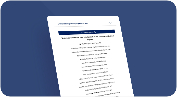 Connected Strategies for Hydrogen Value Chain ^ Top ^ 1 Acknowledgements We share our sincere thanks to the following people for their insights and contributions to this paper Rajiv Murali, Managing Director & Partner, BCG Chris DiGiovanni, Manager, Gas Strategy & Policy, Pacific Gas and Electric Company Sudharson S., Connected and Autonomous Vehicles Business Development, Nvidia David Snoswell, Technical Principal, Schlumberger New Energy Kapil Kedia, Assistant Chief Engineer, General Motors Aaron Melson, IOT Research, Ford Motor Company James Kast, Hydrogen Infrastructure Manager, Toyota Andrew Mingst, General Manager, Hydrogen, Chevron Yousif Abudra, Hydrogen Commercial Lead, Chevron Michael Ruddock, Hydrogen Business Development Manager, Chevron Keith Shaw, Global OEM Heavy Duty Truck & Non-Road Sectors, Chevron Darin Rice, General Manager, Hydrogen Strategy & Market Insights, Chevron Abhishek Banerjee, Hydrogen Commercial Manager, Shell Jarred Guthrie, Global Head of Hydrogen Projects, Shell Susannah Pierce, President and Country Chair Canada, VP Emerging Energy Solutions, Shell James Kast, Clean Energy and Self Improvement Enthusiast, Toyota North America Andreas Matzakos, Ph.D., Academic Partnerships Manager, Shell