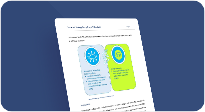 Connected Strategy for Hydrogen Value Chain ^ Top ^ 25 autonomous truck. This will likely be paired with a subscription based autonomous driving service which is still being developed. Figure 11 | Emerging autonomous monetization model Implications Smart freight made possible via digitalization and connected strategies such as driverless operation will soon self-identify and self-monitor. When paired with a hydrogen powertrain they pose a formidable solution for safe and zero carbon logistics. The autonomous technology companies are the new entrants that are starting to dominate the central hub position in a hub and spoke partnership model. These new entrants act as an aggregator, bringing attributes of power train, truck chassis and fueling infrastructure under their proprietary autonomous architecture. Monetization models are emerging wherein autonomous technology companies are providing autonomous mobility as a service on a pay per mile basis to logistics providers. This pay per-mile fee is part of a subscription program for fleets where a “turnkey virtual driver” works across an autonomous freight network. “The connected truck-as-a-service” market will continue to grow and is anticipated to surpass $99.2 billion 8. Over time growing partnerships and unique interface
