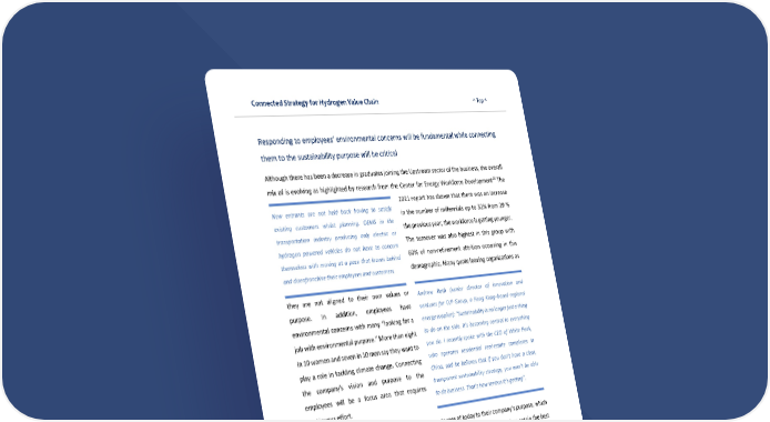 Connected Strategy for Hydrogen Value Chain ^ Top ^ 55 0 Responding to employees’ environmental concerns will be fundamental while connecting them to the sustainability purpose will be critical Although there has been a decrease in graduates joining the Upstream sector of the business, the overall mix of is evolving as highlighted by research from the Center for Energy Workforce Development20 The 2021 report has shown that there was an increase in the number of millennials up to 32% from 29 % the previous year, the workforce is getting younger. The turnover was also highest in this group with 60% of non-retirement attrition occurring in this demographic. Many quote leaving organizations as they are not aligned to their own values or purpose. In addition, employees have environmental concerns with many “looking for a job with environmental purpose.” More than eight in 10 women and seven in 10 men say they want to play a role in tackling climate change. Connecting the company's vision and purpose to the employees will be a focus area that requires continuous effort. Companies will therefore need to re-connect their employees of today to their company’s purpose, which will need to have a compelling story from a sustainability standpoint. To attract and then retain the best talent, companies will need to connect employees to work those matters. A workforce where they feel engaged and connected to purpose, empowered to act on and take decisions and energized around solving problems that matter. Employees need to see that the work they are doing is driving towards a bigger goal. What makes this hard is that for the established companies, they cannot leave behind or disenfranchise the employees who are working in the traditional business. Everyone must feel that they are part of this shared journey. New entrants are not held back having to satisfy existing customers whilst planning. OEMS in the transportation industry producing only electric or hydrogen powered vehicles do not have to concern themselves with moving at a pace that leaves behind and disenfranchise their employees and customers. Andrew Roth (senior director of innovation and ventures for CLP Group, a Hong Kong–based regional energy supplier): “Sustainability is no longer just a thing to do on the side. It’s becoming central to everything you do. I recently spoke with the CEO of White Peak, who operates residential real-estate complexes in China, and he believes that if you don’t have a clear, transparent sustainability strategy, you won’t be able to do business. That’s how serious it’s getting”.