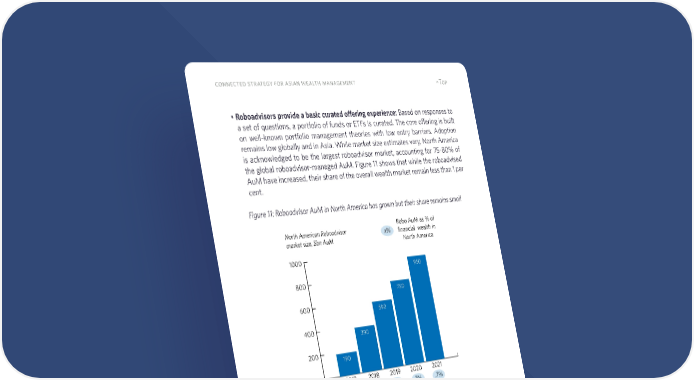 30 connected strategy for asian wealth management ^Top • Roboadvisors provide a basic curated offering experience: Based on responses to a set of questions, a portfolio of funds or ETFs is curated. The core offering is built on well-known portfolio management theories with low entry barriers. Adoption remains low globally and in Asia. While market size estimates vary, North America is acknowledged to be the largest roboadvisor market, accounting for 75-80% of the global roboadvisor-managed AuM. Figure 11 shows that while the roboadvised AuM have increased, their share of the overall wealth market remain less than 1 per cent. Figure 11: Roboadvisor AuM in North America has grown but their share remains small coach behavior Archetype and addressable market: While the previous two strategies require clients to identify their needs, a Connected Coach Behavior strategy proactively reminds clients of their needs, nudges them to take steps to achieve their wealth goals and shepherds them through the curation and decision-making (see Figure 12). This is particularly impactful in wealth management given client inertia to act — because the client may lack the expertise, time 0 200 400 600 800 1000 190 390 590 750 950 2017 2018 2019 2020 2021 .2% .4% .6% .7% .7% North American Roboadvisor market size, $bn AuM x% Robo AuM as % of financial wealth in North America Source: Authors' analysis