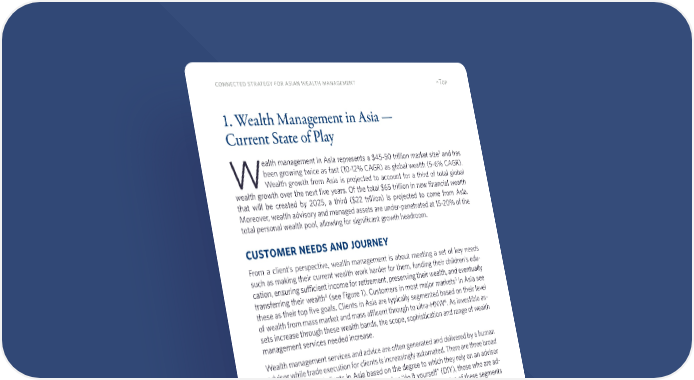 7 connected strategy for asian wealth management ^Top 1. Wealth Management in Asia — Current State of Play W ealth management in Asia represents a $45-50 trillion market size3 and has been growing twice as fast (10-12% CAGR) as global wealth (5-6% CAGR). Wealth growth from Asia is projected to account for a third of total global wealth growth over the next five years. Of the total $65 trillion in new financial wealth that will be created by 2025, a third ($22 trillion) is projected to come from Asia. Moreover, wealth advisory and managed assets are under-penetrated at 15-20% of the total personal wealth pool, allowing for significant growth headroom. customer needs and journey From a client’s perspective, wealth management is about meeting a set of key needs such as making their current wealth work harder for them, funding their children’s edu- cation, ensuring sufficient income for retirement, preserving their wealth, and eventually transferring their wealth4 (see Figure 1). Customers in most major markets5 in Asia see these as their top five goals. Clients in Asia are typically segmented based on their level of wealth from mass market and mass affluent through to ultra-HNW6. As investible as- sets increase through these wealth bands, the scope, sophistication and range of wealth management services needed increase. Wealth management services and advice are often generated and delivered by a human advisor while trade execution for clients is increasingly automated. There are three broad behavioral types of clients in Asia based on the degree to which they rely on an advisor (see Figure 27). Those who are self-directed or “do it yourself” (DIY), those who are ad- vice seekers and those who are delegators. While precise estimates of these segments vary across markets in Asia, most consumer studies8 indicate that the two largest groups by far are the self-directed (30-50% of consumers) and the advice seekers (40-65% of consumers). A relatively small group (5-10% of consumers) are delegators. Particularly 3 BCG Global wealth reports, 2009-20; Includes cash, deposits, bonds, stocks, funds, insurance, pensions and select other assets 4 “One step forward, half a step back: Meeting financial goals in Asia”, Manulife Asset Management, 2015 5 Based on survey results in China, Hong Kong, Indonesia, Japan, Malaysia, the Philippines, Singapore and Taiwan 6 Investible assets per client: Mass $30m 7 “Asia: Hong Kong FinTech company launches roboadvisor app”, RFI Group, 2017 8 Triangulated across Deloitte, Accenture, RFI