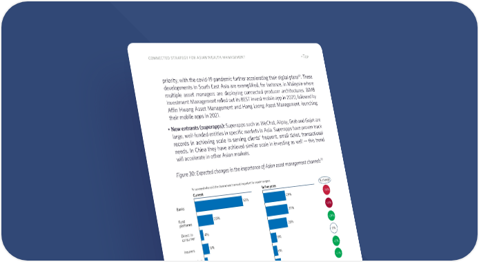 68 connected strategy for asian wealth management ^Top priority, with the covid-19 pandemic further accelerating their digital plans69. These developments in South East Asia are exemplified, for instance, in Malaysia where multiple asset managers are deploying connected producer architectures. BIMB Investment Management rolled out its BEST Invest mobile app in 2020, followed by Affin Hwang Asset Management and Hong Leong Asset Management, launching their mobile apps in 2021. • New entrants (superapps): Superapps such as WeChat, Alipay, Grab and Gojek are large, well-funded entities in specific markets in Asia. Superapps have proven track records in achieving scale in serving clients’ frequent, small ticket, transactional needs. In China they have achieved similar scale in investing as well — this trend will accelerate in other Asian markets. Figure 30: Expected changes in the importance of Asian asset management channels70 • New entrants (fintechs): Business-to-consumer wealth fintechs tend to have sim- ilar offerings, anchored around a basic roboadvisory service that is commoditized. With a limited client base and high acquisition costs, it is unclear whether these firms have the resources or demand to deploy and reap the rewards of connected 69 Survey of Asian asset managers by Cerulli Associates 70 “There’s no turning back”, Funds Europe, 2020 0% 20% 40% 60% 80% Banks Fund platforms Insurers Direct to consumer Independent advisors New entrants 1% 4% 4% 8% 20% 63% Current % surveyed who said the channel was the most important for asset managers In five years 0% 20% 40% 60% 80% 29% 29% 8% 6% 8% 25% % change -34% +9% +21% 0% +2% +7% Source: Funds Europe