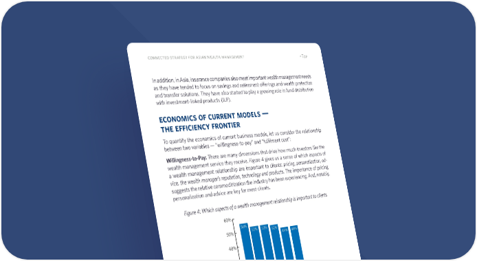13 connected strategy for asian wealth management ^Top In addition, in Asia, insurance companies also meet important wealth management needs as they have tended to focus on savings and retirement offerings and wealth protection and transfer solutions. They have also started to play a growing role in fund distribution with investment-linked products (ILP). economics of current models — the efficiency frontier To quantify the economics of current business models, let us consider the relationship between two variables — “willingness-to-pay” and “fulfilment cost”: Willingness-to-Pay: There are many dimensions that drive how much investors like the wealth management service they receive. Figure 4 gives us a sense of which aspects of a wealth management relationship are important to clients: pricing, personalization, ad- vice, the wealth manager’s reputation, technology and products. The importance of pricing suggests the relative commoditization the industry has been experiencing. And, notably, personalization and advice are key for most clients. Figure 4: Which aspects of a wealth management relationship is important to clients 0% 10% 20% 30% 40% 50% 60% Products Technology Reputation Advice Personalization Pricing 56% 53% 53% 52% 49% 49% Source: E&Y, 2021