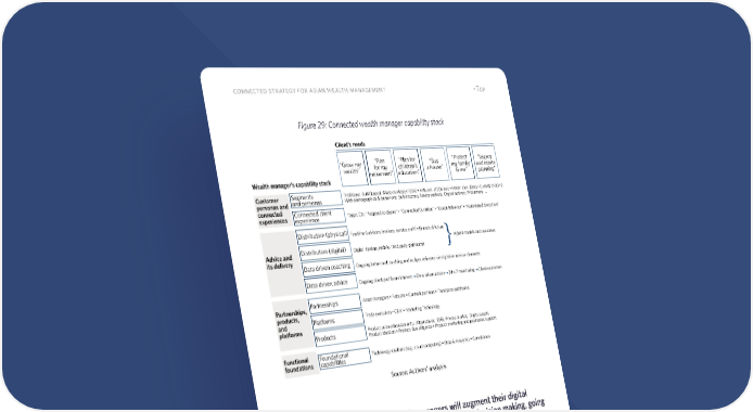 64 connected strategy for asian wealth management ^Top Figure 29: Connected wealth manager capability stack Implication #1. Connected wealth managers will augment their digital channel experiences and capabilities for advice and decision making, going beyond transactional convenience Digital channels are currently designed for “self-directed” traders and roboadvised cli- ents. The channel for advice-seekers and for guiding clients’ decision making remains branch-based or remote personnel. We expect that this will change as the scope of digital advice expands and its sophistication and personalization increases. The advice will be accessed and acted on digitally by both “self-directed” clients and advice seekers. The latter group of clients will be able to access on demand human or virtual advisors to guide them through the digital advice content much the same way as an Amazon customer service representative can see a customer’s shopping cart, preferences and co-browse content to guide the customer through the purchase process. Client’s needs “Grow my wealth” “Plan for my retirement” “Plan for children’s education” “Buy a house” “Protect my family & me” “Legacy and estate planning” } Traditional AuM based: Mass market (30m) With demographics & behaviors: Self directed; Advice seekers; Digital natives; Prosumers; … Wealth manager’s capability stack Customer personas and connected experiences Advice and its delivery Partnerships, products, and platforms Functional foundations Segments and personas Connected client experience Target CX: “Respond to desire” • “Connected Curation” • “Coach Behavior” • “Automated Execution” Distribution (physical) Distribution (digital) Data driven coaching Data driven advice Partnerships Platforms Products Frontline (advisors, bankers, service staf) • Branch of future Digital (online, mobile, third party platforms) Ongoing behavioral coaching and nudges delivered via digital or advisor channels Ongoing client profile enrichment Data driven advice 24 x 7 monitoring Client outcomes Hybrid models and use cases Foundational capabilities Asset managers • Fintechs • Content partners • Third party platforms Trade execution • CRM • Marketing Technology Product suite enhancements: Alternatives; ESG; Private market; Digital assets Product ideation • Product due diligence • Product marketing and post sales support Technology enablers (e.g., cloud computing) • Data & Analytics • Compliance Source: Authors' analysis