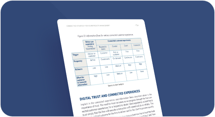43 connected strategy for asian wealth management ^Top digital trust and connected experiences Implicit in the connected experiences and information flows described above is the importance of trust. The need for trust increases as we progress through the four con- nected customer experiences. For a ‘respond-to-desire’ client experience, a client has to trust simply that the firm will execute a transaction with speed and do so reliably. This is a clearly defined outcome for the firm to deliver and for the client to perceive quickly. For a Curated Offering, the bar for trust is higher since a client now has to trust the trade execution and the advice received on the “what to buy (or sell)”, “when to buy” and “how much to buy” decisions. Importantly, the outcome of advice is not instantly clear to the client since the investment outcomes are displaced in time from when the investment decision is made and are impacted by broader market conditions, the underlying expo- sures, the client’s own behavior (do they buy high, sell low?) among other factors. For Coach Behavior, the required level of trust increases further in that the connected nudges need to be demonstrably in the client’s best interest, easy to understand and act on. Finally, with Automated Execution a client has to completely trust the wealth manager. Figure 22: Information flows for various connected customer experiences Status quo experience Analog, ‘disconnected’ Connected customer experiences Respond to desire Curated Coach Automated Trigger Advisor or customer Customer Firm or customer Firm Firm Frequency Ad hoc On demand On demand Continuous Continuous Richness Low Low Medium High High Effort for customer to transmit information High Low Medium Low None Source: Authors' analysis