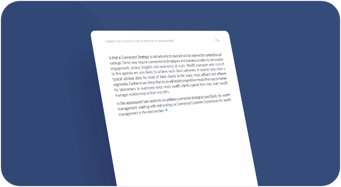 21 connected strategy for asian wealth management ^Top is that a Connected Strategy is not only nice to have but will be required for competitive ad- vantage. Firms now require connected technologies and business models to personalize engagement, advice, insights and experience at scale. Wealth managers who commit to this agenda are also likely to achieve such client outcomes in superior ways than a typical advisor does for most of their clients in the mass, mass affluent and affluent segments. Furthermore, firms that do so will build competitive moats that may be harder for latecomers to overcome since most wealth clients typical form their main wealth manager relationship in their mid-30’s. In the subsequent two sections we address connected strategies specifically for wealth management, starting with elaborating on Connected Customer Experiences for wealth management in the next section.