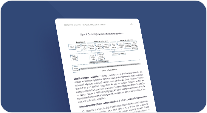 27 connected strategy for asian wealth management ^Top Figure 9: Curated Offering connected customer experience Wealth manager capabilities: The key capability here is a data-driven, connected and scalable recommender system that can personalize and curate relevant investment ideas instead of relying on individual advisors to do so client by client. Amazon’s “Recom- mended for you”, Netflix’s “Suggestions for you” or Spotify’s “Discover weekly” are examples of data from connected experiences being used to achieve distinctive curation for clients. The use of Artificial Intelligence (AI) based recommender systems in wealth management is nascent but leading wealth managers are increasingly investing to test, learn and scale such capabilities. Criteria to test the efficacy and connectedness of a firm’s curated offering experience ¨ Does the firm have the digital wealth capabilities to facilitate creation of a large, relevant data set? (i.e., can a client perform many of their “jobs to be done” digitally — account opening, risk profile creation, accessing research, viewing portfolio and trade information, placing trades, interacting with advisors — allowing a richer data set to be tracked and built) ¨ Does the curation rely on a frequent, ongoing data feed from the clients? ¨ Are investment ideas curated client-by-client or automated at scale? ¨ Does the curation process use personas and cohort-based curation (e.g., “Inves- tors like you…”)? ¨ Is the curation personalized to each client based on their stated and revealed preferences? Source: Authors' analysis Search for investment options Latent need Client Aware of need Evaluate investment options Decide on investment option Place order and pay Recognize need Request the desired option Receive investment product Experience the product performance Post purchase monitoring of product and portfolio Respond with desired option Get order Fulfil order Advisor (employee) Wealth manager (Firm) The advisor’s role evolves to focus more on delivering and explaining investment advice as opposed to generating investment advice Provide search tools Generate tailored investment ideas AI-based recommendation engines