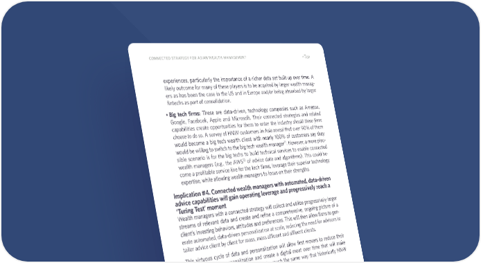 69 connected strategy for asian wealth management ^Top experiences, particularly the importance of a richer data set built up over time. A likely outcome for many of these players is to be acquired by larger wealth manag- ers as has been the case in the US and in Europe and/or being absorbed by larger fintechs as part of consolidation. • Big tech firms: These are data-driven, technology companies such as Amazon, Google, Facebook, Apple and Microsoft. Their connected strategies and related capabilities create opportunities for them to enter the industry should these firms choose to do so. A survey of HNW customers in Asia reveal that over 90% of them would become a big tech wealth client with nearly 100% of customers say they would be willing to switch to the big tech wealth manager71. However, a more plau- sible scenario is for the big techs to build technical services to enable connected wealth managers (e.g., the AWS72 of advice data and algorithms). This could be- come a profitable service line for the tech firms, leverage their superior technology expertise, while allowing wealth managers to focus on their strengths. Implication #4. Connected wealth managers with automated, data-driven advice capabilities will gain operating leverage and progressively reach a ‘Turing Test’ moment Wealth managers with a connected strategy will collect and utilize progressively larger streams of relevant data and create and refine a comprehensive, ongoing picture of a client’s investing behaviors, attitudes and preferences. This will then allow firms to gen- erate automated, data-driven personalization at scale, reducing the need for advisors to tailor advice client by client for mass, mass affluent and affluent clients. This virtuous cycle of data and personalization will allow first movers to reduce their marginal cost for personalization and create a digital moat over time that will make it harder for competitors to poach clients, much the same way that historically HNW clients were attached to their personal wealth advisor. Over time, the advice that is generated will approach a ‘Turing Test’73 moment when clients will find it harder to discern whether the advice was generated by a human or an algorithm. Indeed, the delivery of the advice via digital channels will also better mimic the “human touch” and sense of intimacy as firms learn to design digital experiences for trust and exclusivity74, which are the emotional underpinnings of wealth management. 71 “Would ‘Google Wealth Management’ be a threat to the industry?”, Fund Selector Asia, 2020 72 Amazon Web Services 73 https://en.wikipedia.org/wiki/Turing_test 74 “Future of Digital Trust Driving forces, trends and their implications on our digital tomorrow”, Deloitte, 2021