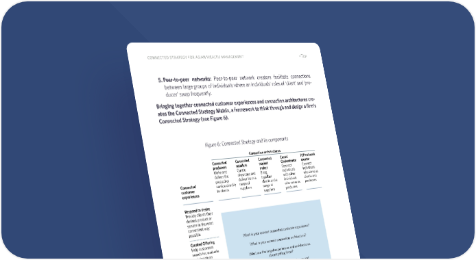 18 connected strategy for asian wealth management ^Top 5. Peer-to-peer networks: Peer-to-peer network creators facilitate connections between large groups of individuals where an individuals’ roles of ‘client’ and ‘pro- ducer’ swap frequently. Bringing together connected customer experiences and connection architectures cre- ates the Connected Strategy Matrix, a framework to think through and design a firm’s Connected Strategy (see Figure 6). Figure 6: Connected Strategy and its components Connected customer experiences Respond to desire Provide clients their desired product or service in the most convenient way possible Curated Ofering Help customers search for, evaluate and decide on options Coach Behavior Proactively identify needs and help nudge clients to take action, addressing behavioral biases Automatic execution Automatically analyze client’s needs and fulfil them on behalf of the client Connection architectures Connected producers Make and deliver the product or service directly to clients Connected retailers Curate, showcase and deliver from a range of suppliers Connected market maker Bring together clients and a range of suppliers Crowd Orchestrator Connect individuals with other individuals who serve as producers P2P network creator Connect individuals who serve as clients and producers What is your current connected customer experience? What is your current connection architecture? What are the target experiences and architectures of competing firms? What connected customer experiences and connection architectures are proving most successful? How should you evolve your target experiences and connection architectures? Source: Connected Strategy, HBR Press, 2019
