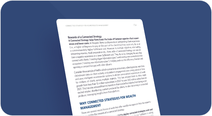 19 connected strategy for asian wealth management ^Top Rewards of a Connected Strategy A Connected Strategy helps firms break the trade-off between superior client experi- ences and lower costs. In the past, firms could provide an outstanding client experience (i.e., a higher willingness-to-pay on the part of the client) but they could only do so at a commensurately higher fulfillment cost. However, in multiple industries, ride hailing, streaming movies, meal preparation etc., firms with a Connected Strategy can now de- liver a superior experience at a lower fulfillment cost. They do so by changing the way they connect with clients (“creating bigger information pipes”) and creating new connections in the ecosystem (“creating new information pipes”), helping push out the efficiency frontier and opening a competitive gap with other players. Consider the example of Netflix which connects to consumers, collects precise, real-time clickstream data on client activity and platform engagement over a long period of time and uses intelligent recommender systems to deliver personalized experiences at scale for millions of clients across multiple markets. This has allowed them to drive rapid growth from less than 10 million subscribers in 2007 to over 200 million subscribers in 2021. This has also allowed them to transform their role in the industry from being a con- nected retailer, distributing content produced by others, to also becoming a connected producer, leveraging insights from their platform. why connected strategies for wealth management There are several macro forces at work that offer wealth managers in Asia the opportu- nity to realize the rewards of a connected strategy. First, the technological capabilities needed to deploy connected strategies exist and are proven: In 2011, Marc Andreesen coined the prescient phrase “software is eating the world’18. In the decade since, connectivity (mobile), data analytics (Artificial Intel- ligence), new interaction models (social networks) and increased computing power (cloud computing) have collectively disrupted entire industries such as retail, media, and transportation. Newer entrants in wealth management who are leveraging tech-enabled models are already disrupting the industry – we will elaborate on Ant Financial in this context later in the paper. Connected strategy is not just a technology transformation but fundamentally a business model innovation, given that the technologies needed for success have often been proven already in other sectors. 18 “Why Software Is Eating the World”, Marc Andreesen, 2011