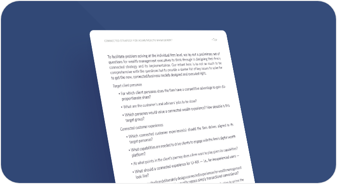 73 connected strategy for asian wealth management ^Top To facilitate problem solving at the individual firm level, we lay out a preliminary set of questions for wealth management executives to think through in designing their firm’s connected strategy and its implementation. Our intent here is to not so much to be comprehensive with the questions but to provide a starter list of key issues to solve for to get the new, connected business models designed and executed right. Target client personas • For which client personas does the firm have a competitive advantage to gain dis- proportionate share? • What are the customer’s and advisors’ jobs to be done? • Which personas would value a connected wealth experience? How sizeable is this target group? Connected customer experiences • Which connected customer experience(s) should the firm deliver, aligned to its target personas? • What capabilities are needed to drive clients to engage with the firm’s digital wealth platform? • At what points in the client’s journey does a firm want to play given its capabilities? • What should a connected experience for UI-NX — i.e., for inexperienced users — look like? • How may the firm deliberately design connected experiences for wealth management that focus on decision making quality versus simply transactional convenience? • How should a firm achieve a critical mass of a priori personalization to prime the data collection loop? • What are the resulting information flows from the connected customer experiences? • How should the firm’s data architecture be adapted to the new information flows? • How should the role of a product manager evolve in light of data-driven advisory capabilities? • What capabilities are needed to drive frequent client engagement with the firm’s digital platform?