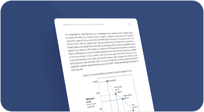 15 connected strategy for asian wealth management ^Top It is important to note that since our whitepaper is an analysis at the industry level, we depict the efficiency frontier across a range of industry sub-sectors and customer segments, ranging from private banks for HNW clients through to roboadvisors for mass market clients. We also believe that capturing the full range of potentially competing of- ferings makes individual firms more alert to developments in and new competitors from adjacent sub-sectors in the industry. A variation of this approach would be to consider a client’s willingness-to-pay for wealth management services that are in practice available to her. For example, a mass market client would also appreciate the brand and services of a private bank but may simply not have the Assets under Management (“AuM”) to be able to become a private bank client. As such, the efficiency frontier could be created for a specific customer segment such as, say, only HNW individuals and players focused on that segment. Figure 5: The current efficiency frontier for wealth managers in Asia In the next section, we describe the concept of a Connected Strategy and make the case that it offers wealth managers a solution to break from the current efficiency frontier, enabling competitive differentiation and scale. $50k 100% 75% 50% 25% 0% Private Banks Fulfillment cost (cost income ratio) Willingness to pay (Avg. rev. per customer) Bank-based wealth managers Online trading platforms Robo advisors** **A typical roboadvisor’s cost income ratio is estimated on a marginal basis Source: Authors' analysis