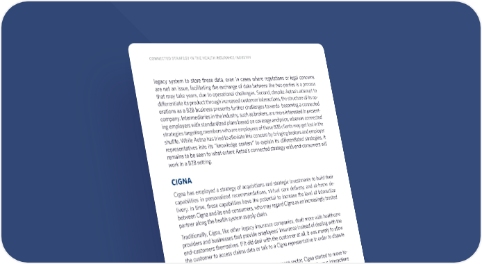 10 connected strategy in the health insurance industry legacy system to store these data, even in cases where regulations or legal concerns are not an issue, facilitating the exchange of data between the two parties is a process that may take years, due to operational challenges. Second, despite Aetna’s attempt to differentiate its product through increased customer interactions, the structure of its op- erations as a B2B business presents further challenges towards becoming a connected company. Intermediaries in the industry, such as brokers, are more interested in present- ing employers with standardized plans based on coverage and price, whereas connected strategies targeting members who are employees of those B2B clients may get lost in the shuffle. While Aetna has tried to alleviate this concern by bringing brokers and employer representatives into its “knowledge centers” to explain its differentiated strategies, it remains to be seen to what extent Aetna’s connected strategy with end-consumers will work in a B2B setting. cigna Cigna has employed a strategy of acquisitions and strategic investments to build their capabilities in personalized recommendations, virtual care delivery, and at-home de- livery. In time, these capabilities have the potential to increase the level of interaction between Cigna and its end-consumers, who may regard Cigna as an increasingly trusted partner along the health system supply chain. Traditionally, Cigna, like other legacy insurance companies, dealt more with healthcare providers and businesses that provide employees’ insurance instead of dealing with the end-customers themselves. If it did deal with the customer at all, it was merely to allow the customer to access claims data or talk to a Cigna representative in order to dispute claims. Yet as health-tech players emerged in the insurance sector, Cigna started to move to- wards developing more connected strategies in order to have continuous interactions with subsets of its members. Cigna partnered with healthcare providers through its Connected Care program, which aims to engage customers by providing them with the right tools to improve their well-being and aligning their goals with that of healthcare providers in order to provide member services besides reimbursement.25 For example, Cigna applied its Connected Care tool for Hepatitis C with great success in terms of achieving a 98.4% cure rate.26 The strategy involved, among others, comprehensive 25 https://s27.q4cdn.com/742843823/files/doc_financial/annual/2019/cigna-2019-annual-report.pdf 26 https://www.cigna.com/about-us/newsroom/news-and-views/press-releases/2015/cignas-connected-care-approach- for-customers-with-hepatitis-c-achieves-984-percent-real-world-cure-rates