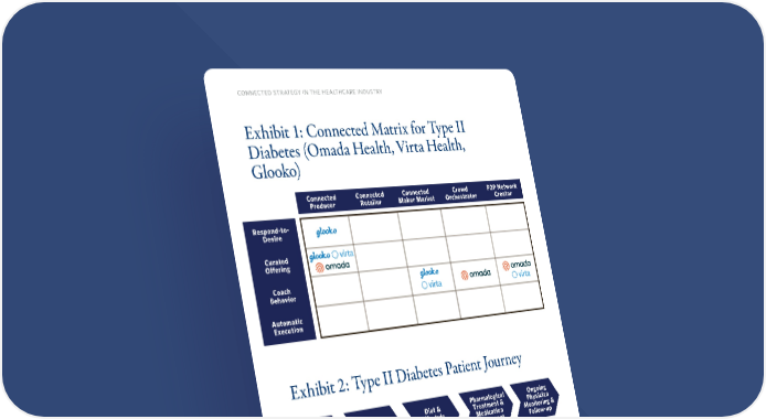 connected strategy in the healthcare industry Exhibit 1: Connected Matrix for Type II Diabetes (Omada Health, Virta Health, Glooko) Exhibit 2: Type II Diabetes Patient Journey Respond-to- Desire Curated Offering Coach Behavior Automatic Execution Connected Producer Connected Maker Market Connected Retailer Crowd Orchestrator P2P Network Creator Screening/ Risk Assessment Diet & Lifestyle Changes Pharmalogical Treatment & Medication Managment Diagnosis Ongoing Physician Monitoring & Follow-up