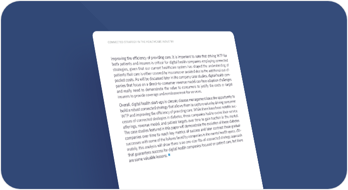7 connected strategy in the healthcare industry improving the efficiency of providing care. It is important to note that driving WTP for both patients and insurers is critical for digital health companies employing connected strategies, given that our current healthcare system has shaped the understanding of patients that care is either covered by insurance or avoided due to the additional out-of- pocket costs. As will be discussed later in the company case studies, digital health com- panies that focus on a direct-to-consumer revenue model can face adoption challenges and really need to demonstrate the value to consumers to justify the costs or target insurers to provide coverage and reimbursement for services. Overall, digital health start-ups in chronic disease management have the opportunity to build a robust connected strategy that allows them to capture value by driving consumer WTP and improving the efficiency of providing care. While there have been notable suc- cesses of connected strategies in diabetes, these companies had to evolve their service offerings, revenue model, and patient targets over time to gain traction in the market. The case studies featured in this paper will demonstrate the evolution of these diabetes companies over time to reach key metrics of success and later contrast these gradual successes with some of the failures faced by companies in the mental health space. Ulti- mately, this analysis will show there is no one-size-fits-all connected strategy approach that guarantees success for digital health companies focused on patient care, but there are some valuable lessons.