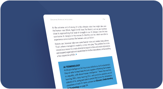 10 Deploying Artificial Intelligence ^Top At the extreme end of strong AI is the ultimate robot that might take over the human race (think: Agent Smith from The Matrix), and we are nowhere close to approaching that level of strength in our AI designs. Even the less worrisome AI designs in the movies Ex Machina and her, which are able to experience consciousness like humans, are just fiction. Robots can, however, take over some human roles and render many jobless. That’s where managerial creativity comes into play. The problem has to be viewed as a reason to create alternative opportunities and create adjacencies and expand organizational capabilities for further innovations, while avoiding a few expensive pitfalls. ai terminology Artificial intelligence (AI) has many definitions, but fundamentally they all refer to machines that are capable of thinking like humans or, arguably, with above human intelligence.17 Terms like machine learning (ML), deep learning (DL), and predictive analytics are all subsets of AI, using past data to predict the future. For detailed ex- planations of such AI terms, please see Glossary: Understanding AI Terminology on page 34. 17 Bernard Marr, “The Key Definitions Of Artificial Intelligence (AI) That Explain Its Importance,” Forbes: Enterprise Tech, February 14, 2018, https://www.forbes.com/sites/bernardmarr/2018/02/14/the-key-definitions-of-artifi- cial-intelligence-ai-that-explain-its-importance/. Stefano A. Bini, “Artificial Intelligence, Machine Learning, Deep Learning, and Cognitive Computing: What Do These Terms Mean and How Will They Impact Health Care?,” The Journal of Arthroplasty 33, no. 8 (2018): 2358- 2361, https://doi.org/10.1016/j.arth.2018.02.067.