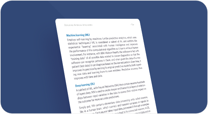 35 Deploying Artificial Intelligence ^Top Machine learning (ML) Employs self-learning by machines (unlike predictive analytics, which uses statistical techniques.) ML is considered a subset of AI, and exhibits the experiential “learning” associated with human intelligence and improves the performance of the computational algorithm as it learns without human involvement. For instance, with IBM Watson Health, the software is fed with “training data” of all possible data related to cancer diagnostics so that the software can recognize patterns in them, and when given the data of a new patient (test data) it can diagnose based on the learned pattern. Over time, it improves its precision by revising its original predictive model by both ingest- ing new data and learning from its own mistakes. Predictive accuracy thus improves with time and data. Deep learning (DL) A subfield of ML, with Neural Networks (NN) that contain neurons hundreds of layers deep. NN is used to create deeper and hierarchical layers of relation- ships between input variables in the data to assess their relative impact on the outcome for more accurate predictions. Simply put, NN contains elementary data processing units called neurons, like in a human brain, which connect and transmit synapses or signals to other neurons. Each neuron takes input data, processes it through a complex mathematical function, and sends an output to its connected neurons. In DL, they are structured in layers with an input layer receiving external data and an output layer throwing out the ultimate output of the algorithm. Sandwiched between the two is a hidden layer of neurons (where data processing hap- pens) with each neuron in each layer connecting with each one in the next layer. While this itself sounds sophisticated, imagine an NN with multiple such hidden layers! The computation gets very sophisticated very quickly. The greater the number of layers and neurons, the deeper the learning is. This architecture enables the neural net to learn non-intuitive and non-linear correlations among variables in the input data.