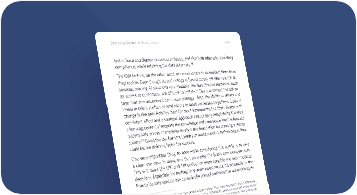 32 Deploying Artificial Intelligence ^Top faster, build and deploy models seamlessly, and also help adhere to regulatory compliance, while retaining the data internally.78 The ORI factors, on the other hand, are more innate to incumbent firms than they realize. Even though AI technology is based mostly on open-source re- sources, making AI solutions very imitable, the less obvious resources, such as access to customers, are difficult to imitate.79 This is a competitive advan- tage that any incumbent can easily leverage. Also, the ability to attract and invest in talent is often second nature to most successful large firms. Cultural change is the only Achilles’ heel for most incumbents, but that’s fixable with consistent effort and a strategic approach encouraging adaptability. Creating a learning center to integrate the knowledge and experience into the firm and disseminate across managerial levels is the foundation for creating a change culture.80 Given the low barriers to entry in the space of AI technology, culture could be the defining factor for success. One very important thing to note while considering this matrix is to have a clear use case in mind, one that leverages the firm’s core competencies. This will make the ORI and TRI evaluation more tangible and inform clearer decisions. Especially for making long-term investments, it’s advisable for the firm to identify specific use cases in the lines of business that are of priority to 78 Martin Giles, “JPMorgan’s CIO Has Championed A Data Platform That Turbocharges AI,” Forbes: CIO Network, December 12, 2019, https://www.forbes.com/sites/martingiles/2019/12/12/jpmorgan-chase-ai-banking-model/. Jeremy Hermann and Mike Del Balso, “Meet Michelangelo: Uber’s Machine Learning Platform,” Uber Data (blog), Uber Engineering, September 15, 2017, https://eng.uber.com/michelangelo-machine-learning-platform/. 79 Makadok, Richard, “Can first-mover and early-mover advantages be sustained in an industry with low bar- riers to entry/imitation?,” Strategic Management Journal 19, no. 7 (1998): 683-696, https://www.jstor.org/sta- ble/3094150. Christine Oliver, “Sustainable Competitive Advantage: Combining Institutional and Resource-Based Views,” Stra- tegic Management Journal 18, no. 9 (1997): 697-713, https://www.jstor.org/stable/3088134. 80 Rita Gunther McGrath, Ian C. Macmillan, and Michael L. Tushman, “The role of executive team actions in shaping dominant designs: Towards the strategic shaping of technological progress,” Strategic Management Jour- nal 13 (1992): 137-161, https://doi.org/10.1002/smj.4250130910. Satyendra Singh, Yolande E. Chan, and James D. McKeen, “Knowledge Management Capability and Organization- al Performance: A Theoretical Foundation,” Organizational Learning, Knowledge and Capabilities Conference paper, University of Warwick, Coventry, UK, March 20-22, 2006, https://warwick.ac.uk/fac/soc/wbs/conf/olkc/archive/ olkc1/papers/144_singh.pdf.