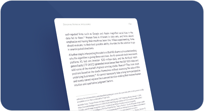 19 Deploying Artificial Intelligence ^Top well-reputed firms such as Google and Apple magnified racial bias in the data fed to them.44 Human bias is inherent in data sets, and firms should emphasize not having their machines learn this. When experimenting, firms should evaluate, to their best possible ability, the risks for the solution to go in unanticipated directions. A further step to interpreting the solutions that ML churns out is understanding why the algorithm is giving these solutions. An AI-powered stock investment platform, K1, lost one investor ~$20 million daily, and the Artificial Intelli- gence Equity ETF (AIEQ) generated more losses than the S&P 500 index and sold some of the market’s highest-winning stocks. Reason? They took stock positions based on the stocks themselves without assessing the value of the underlying businesses.45 AI cannot necessarily take a long-term perspective and surely cannot replace the nuanced decision-making that involves human intuition and qualitative judgment factors. withdrew the bot immediately and relaunched a redesigned version, four years later, after building a more socially acceptable version that can defend itself from trolls. 44 Jackie Snow, “Google Photos Still Has a Problem with Gorillas,” MIT Technology Review, January 11, 2018, https://www.technologyreview.com/2018/01/11/146257/google-photos-still-has-a-problem-with-gorillas/. Google’s search image recognition system mislabeled an African American woman as a gorilla. Corinne Reid, “Artificial Intelligence Will Do What We Ask. That’s a Problem,” Quanta Magazine: Artificial Intelli- gence, January 30, 2020, https://www.quantamagazine.org/artificial-intelligence-will-do-what-we-ask-thats-a- problem-20200130/. YouTube’s algorithm recommended disturbing and conspiratorial content. Jeffrey Dastin, “Amazon scraps secret AI recruiting tool that showed bias against women,” Reuters, October 10, 2018, https://www.reuters.com/article/us-amazon-com-jobs-automation-insight/amazon-scraps-secret-ai-re- cruiting-tool-that-showed-bias-against-women-idUSKCN1MK08G. Amazon’s AI-based recruiting engine recom- mended hiring predominantly white males. Sridhar Natarajan and Shahien Nasiripour, “Viral Tweet About Apple Card Leads to Goldman Sachs Probe,” Bloomberg: Business, November 9, 2019, https://www.bloomberg.com/news/articles/2019-11-09/viral-tweet- about-apple-card-leads-to-probe-into-goldman-sachs. Apple algorithms were revealed to have gender disparity when determining creditworthiness. 45 Thomas Beardsworth and Nishant Kumar, “Who to Sue When a Robot Loses Your Fortune,” Blomberg: Future Finance, May 5, 2019, https://www.bloomberg.com/news/articles/2019-05-06/who-to-sue-when-a-robot-loses- your-fortune. Keith Speights, “An AI-Powered ETF Failed Miserably at Beating the Market in 2018 -- Here’s What You Can Learn From Its Mistakes,” The Motley Fool, January 6, 2019, https://www.fool.com/investing/2019/01/06/an-ai-pow- ered-etf-failed-miserably-at-beating-the.aspx.