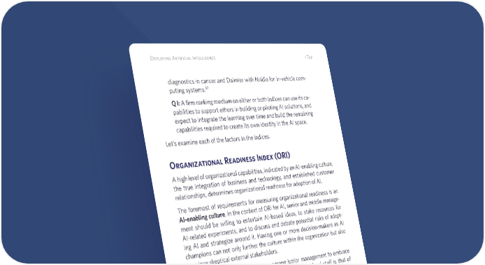 25 Deploying Artificial Intelligence ^Top diagnostics in cancer and Daimler with Nvidia for in-vehicle com- puting systems.57 Q I: A firm ranking medium on either or both indices can use its ca- pabilities to support others in building or piloting AI solutions, and expect to integrate the learning over time and build the remaining capabilities required to create its own identity in the AI space. Let’s examine each of the factors in the indices. Organizational Readiness Index (ORI) A high level of organizational capabilities, indicated by an AI-enabling culture, the true integration of business and technology, and established customer relationships, determines organizational readiness for adoption of AI. The foremost of requirements for measuring organizational readiness is an AI-enabling culture. In the context of ORI for AI, senior and middle manage- ment should be willing to entertain AI-based ideas, to stake resources for AI-related experiments, and to discuss and debate potential risks of adopt- ing AI and strategize around it. Having one or more decision-makers as AI champions can not only further the culture within the organization but also convince skeptical external stakeholders. Equally important is the willingness among junior management to embrace change. The most common threat that plagues junior-level staff is that of displacement; but existing employees can be sources of value and retraining them for transferability to other functions and business units can help gain greater buy-in. 57 Royal Philips, Philips and PathAI team up to improve breast cancer diagnosis using artificial intelligence tech- nology in big data pathology research, https://www.philips.com/a-w/about/news/archive/standard/news/ press/2017/20170329-philips-and-pathai-team-up-to-improve-breast-cancer-diagnosis.html. Mercedes-Benz AG and NVIDIA, Mercedes-Benz and NVIDIA to Build Software-Defined Computing Architecture for Automated Driving Across Future Fleet, June 23, 2020, https://media.mercedes-benz.it/download/881001/pi-mer- cedes-benz-nvidia-en.pdf.