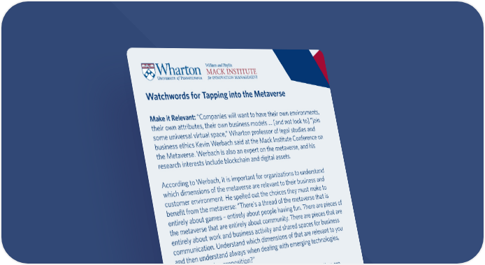Watchwords for Tapping into the Metaverse Make it Relevant: “Companies will want to have their own environments, their own attributes, their own business models … [and not look to] ”join some universal virtual space,” Wharton professor of legal studies and business ethics Kevin Werbach said at the Mack Institute Conference on the Metaverse. Werbach is also an expert on the metaverse, and his research interests include blockchain and digital assets. According to Werbach, it is important for organizations to understand which dimensions of the metaverse are relevant to their business and customer environment. He spelled out the choices they must make to benefit from the metaverse: “There's a thread of the metaverse that is entirely about games – entirely about people having fun. There are pieces of the metaverse that are entirely about community. There are pieces that are entirely about work and business activity and shared spaces for business communication. Understand which dimensions of that are relevant to you and then understand always when dealing with emerging technologies, what's your value proposition?” From Physical to Virtual: Kahn offered some tips on how retailers are preparing themselves for the metaverse. As a first step, some companies are trying to translate their physical experience into a virtual one, she said. She pointed to the fast-casual food chain Chipotle, which invites its customers to put together a burrito virtually, and then Chipotle would connect that virtual creation with the real product and deliver it in real time. Fashion brand Dolce Gabbana, for instance, got its metaverse feet wet at the Decentraland Fashion Week, March 2022, where it had virtual catwalks, using cats as the models.