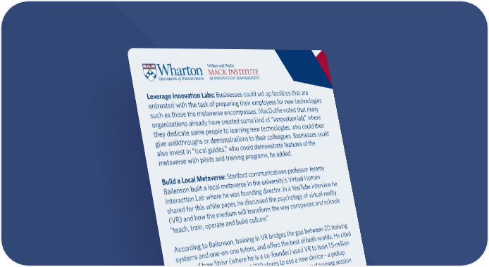 Leverage Innovation Labs: Businesses could set up facilities that are entrusted with the task of preparing their employees for new technologies such as those the metaverse encompasses. MacDuffie noted that many organizations already have created some kind of “innovation lab,” where they dedicate some people to learning new technologies, who could then give walkthroughs or demonstrations to their colleagues. Businesses could also invest in “local guides,” who could demonstrate features of the metaverse with pilots and training programs, he added. Build a Local Metaverse: Stanford communications professor Jeremy Bailenson built a local metaverse in the university’s Virtual Human Interaction Lab where he was founding director. In a YouTube interview he shared for this white paper, he discussed the psychology of virtual reality (VR) and how the medium will transform the way companies and schools "teach, train, operate and build culture.” According to Bailenson, training in VR bridges the gap between 2D training systems and one-on-one tutors, and offers the best of both worlds. He cited a case of how Strivr (where he is a co-founder) used VR to train 1.5 million Walmart associates across 4,700 stores to use a new device – a pickup tower– through 17 VR training stations. While the original training session was eight hours long, the VR version allowed it to be condensed into 15 minutes without any loss in the level of expertise Walmart associates acquired. Also they didn’t have to travel offsite for their training; remote learning through the VR program helped them save almost an entire workday. The training covered everything from how a deli store manager could handle multiple customers at once to ensuring that corn cobs are not stacked too high that they block ventilation or flout a code, Bailenson wrote in his book on virtual reality, “Experience on Demand.”