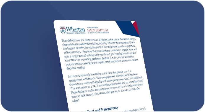 That definition of the metaverse as it relates to the use of the senses comes clearly into play when the retailing industry inhabits the metaverse. One of the biggest benefits for retailing is that the metaverse boosts engagement with customers. “Any time that you can have a consumer engage more and over a longer period of time with your brand, you’re going to build loyalty,” said Wharton marketing professor Barbara E. Kahn, whose specialties include variety seeking, brand loyalty, retail assortment issues and patient decision-making. An important metric in retailing is the time that people spend in engagement with brands. “More engagement with the brand has been shown to correlate with loyalty and subsequent conversion,” she explained. “The metaverse as a 24/7, immersive, experiential and social environment.” Those features enable the metaverse to serve as “a virtual platform where you can look around, visit stores, play games, or attend a concert, she added. Building Trust and Transparency The metaverse is linked with blockchain, which adds new layers of trust, transparency, security and traceability that facilitate commerce in the virtual world. For instance, blockchain enables payments in the metaverse for transactions involving virtual assets. “If someone creates something in the metaverse, say an artistic endeavor, and if it’s associated with blockchain, you can trace their history give them unique credit for their work, and they can earn revenues off the lifetime of the piece,” said Kahn, who was formerly director of the Jay H. Baker Retailing Center at Wharton. Those creations could be paid for through NFTs, or nonfungible tokens, which are digital assets stored on the blockchain, representing proof of ownership and authenticity; they cannot be edited, copied or duplicated.