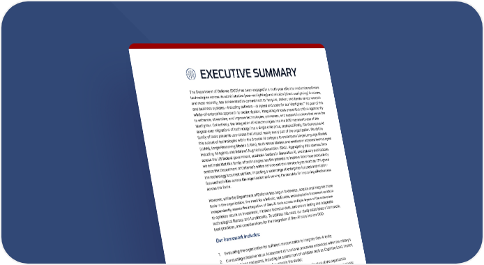 6 EXECUTIVE SUMMARY The Department of Defense (DOD) has been engaged in a multi-year effort to modernize software technologies across its administrative (non-warfighting) and mission (direct warfighting) functions, and most recently, has accelerated its commitment to “acquire, deliver, and iterate on our weapon and business systems – including software – at speed and scale for our Warfighter.”1 As part of this whole-of-enterprise approach to modernization, integrating AI tools presents a critical opportunity to enhance, streamline, and improve technologies, processes, and support functions that serve the Warfighter. Collectively, the integration of AI technologies into the DOD represents one of the largest-ever migrations of technology into a single enterprise, and specifically, the Generative AI family of tools presents use-cases that impact nearly every part of the organization. We define this subset of technologies within the broader AI category to encompass Large Language Models (LLMs), Large Reasoning Models (LRMs), Multi-Modal Models and enabled or adjacent technologies including AI Agents and Retrieval Augmented Generation (RAG). Aggregating data sources from across the US federal government, academic leaders in Generative AI, and industry publications, we estimate that this family of technologies has the potential to improve labor-hour productivity across the Department of Defense’s active service and civil service by as much as 17% given the technology’s current abilities, impacting a wide range of enterprise-focused and mission- focused activities across the organization and serving the mandate for improving effectiveness across the force. However, while the Department of Defense has begun to develop, acquire and integrate these tools in the organization, the need for a holistic, replicable, and adaptable framework exists to independently assess the integration of Gen-AI tools across multiple layers of the enterprise to optimize return on investment, minimize technical debt, and ensure lasting and adaptable technological literacy and functionality. To address this need, our study establishes a framework, best practices, and considerations for the integration of Gen-AI tools into the DOD. Our framework includes: 1. Evaluating the organization for sufficient modernization to integrate Gen-AI tools; 2. Conducting a Relative Value Assessment of functional processes embedded within the military’s many divisions and teams, including an assessment of variables such as Cognitive Load, Impact, KPI Relevance, and Risk (each discussed in the study); 3. Planning multiple aspects of the necessary technological architecture of the organization against Gen-AI tools and identifying best practices in comparing potential vendors and models; 4. Executing the integration of the tools such that their value to the enterprise is preserved and expanded long-term through practices related to change management, and workforce training. The study then discusses notable considerations and dual-use applications that the private sector should monitor and apply to their own challenges with Gen-AI tools as the long-term integration of Gen-AI into the US military unfolds. Generative AI Adoption in the US Military