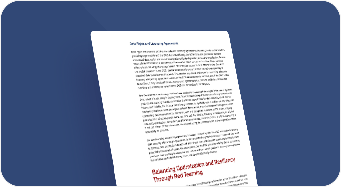14 Data Rights and Licensing Agreements Data rights are a central point of contention in licensing agreements between private sector vendors providing large models and the DOD. More specifically, the DOD stores and processes massive amounts of data, which are stored and organized highly disparately across the organization. Further, much of this information is Sensitive But Unclassified (SBU) as well as Classified. Major vendors offering tools like Large Language Models often require access to client data to further fine-tune the model; however, in the DOD, stricter data controls prevent models trained on proprietary or classified data to be licensed back out. This creates significant challenges to identifying adequate licensing and pricing agreements between the DOD and commercial vendors, and if the DOD rushes acquisition, it may find itself locked into contract agreements that become inefficient or obsolete over time and thereby serve neither the DOD nor its vendors in the long run. One Generative AI technology that has been applied to the issue of data rights is the use of Synthetic Data, albeit it is still early in development. The critical challenge that startups offering synthetic data products are working to address includes the DOD’s top priorities for data security, which include Privacy and Fidelity. For Privacy, the primary concern for synthetic data is to filter out any datapoints that by implication expose the original dataset (for example, a synthetic dataset listing government contracting business owners by net worth, with 2-3 data points in excess of $10 billion, implying just a handful of actual people in the real data set). For Fidelity, focusing on replicating the original data set’s distribution, correlation, and for time series data, interarrival-time, is critical to ensuring it is not too ‘clean’ or too imbalanced, thereby reflecting the characteristics of the original data set as accurately as possible. For any licensing and pricing agreement, however, contracting with the DOD will involve balancing data security with pricing adjustments for any model training that does occur. Teams will also need to forecast how pricing for a handful of pilot-phase users translates to scaled implementation with potentially thousands of users. We recommend that the DOD prioritize refining Gen-AI contracting practices that are likely to stand the test of time and serve both parties in the long run—a process that will take dedicated funding, labor, and time to effectively develop. Balancing Optimization and Resiliency Through Red Teaming While AI tools present a compelling case for addressing inefficiencies across the military related to maintenance, over-relying on technology to monitor and optimize these functions can detract from the force’s broad operations, specifically its ability to manage inherently unpredictable events that profoundly impact—and even shutdown—other logistical functions in wartime settings. Such is particularly true for resupply chains and strategic planning, as Chris Daehnick, former US Air Force Colonel and a former Associate Partner at McKinsey, notes, Chris further adds: If a military builds its operations to be highly efficient and dependent on AI, it’s likely to be a fragile system that breaks easily; it can’t cope with what you don’t expect from past experience, similar to how an overly centralized command and control system can cause paralysis and break down under stress. Taking out slack from any system weakens the system’s ability to withstand future shocks. war is inherently wasteful, and over-optimizing reduces resilience and creates vulnerabilities in a military’s operational systems. “ “ Generative AI Adoption in the US Military