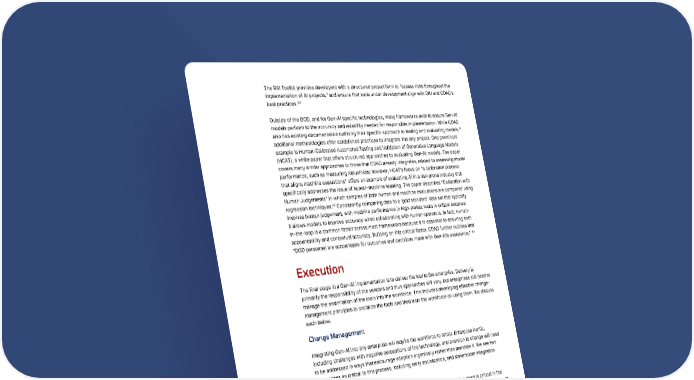 34 The RAI Toolkit provides developers with a structured project form to “assess risks throughout the implementation of AI projects,” and ensure that tools under development align with DIU and CDAO’s best practices.40 Outside of the DOD, and for Gen-AI specific technologies, many frameworks exist to ensure Gen-AI models perform to the accuracy and reliability needed for responsible implementation. While CDAO also has existing documentation outlining their specific approach to testing and evaluating models,41 additional methodologies offer established practices to integrate into any project. One prominent example is Human-Calibrated Automated Testing and Validation of Generative Language Models (HCAT), a white paper that offers structured approaches to evaluating Gen-AI models. The paper covers many similar approaches to those that CDAO already integrates, related to assessing model performance, such as measuring robustness; however, HCAT’s focus on “a calibration process that aligns machine evaluations” offers an example of evaluating AI in a risk-prone industry that specifically addresses the issue of human-machine teaming. The paper describes “Calibration with Human Judgements” in which samples of both human and machine evaluations are compared using regression techniques.42 Consistently comparing data to a ‘gold standard’ data set that typically involves human judgement, with machine performance in high-stakes tasks is critical because it allows models to improve accuracy when collaborating with human operators. In fact, human- in-the-loop is a common factor across most frameworks because it is essential to ensuring both accountability and contextual accuracy. Building on this critical factor, CDAO further outlines that “DOD personnel are accountable for outcomes and decisions made with Gen-AI’s assistance.” 43 Execution The final stage in a Gen-AI implementation is to deliver the tool to the enterprise. Delivery is primarily the responsibility of the vendors and thus approaches will vary, but enterprises still need to manage the assimilation of the tools into the workforce. This includes developing effective change- management principles to socialize the tools and then train the workforce on using them. We discuss each below. Change Management Integrating Gen-AI into any enterprise will require the workforce to retool. Enterprise inertia, including challenges with negative perceptions of the technology, and aversion to change will need to be addressed in ways that encourage adoption organically rather than mandate it. We see two approaches as critical to this process, including early socialization, and stakeholder integration during development. For socialization, communication with stakeholders across the organization chart is critical in the early stages of any integration. Developing the tools in a black box without stakeholder involvement throughout the process risks significantly under-serving the user base in the long run. We recommend addressing this by incorporating end-users into tool development through on-premises working sessions, fine-tuning, formal discussions, and direct co-development when possible. These practices ensure that the tools are developed alongside end-users, building familiarity and buy- in. The format of communication is equally important as the method; avoiding ‘jargon’ and plainly describing technical concepts will make the tools more relatable and enable faster understanding of how to apply them. Further, consistent demonstrations of the product and informal discussions with stakeholders can build individualized understanding of the tools before rolling them out. These practices collectively increase familiarity with the tools before formal training and integration begins thereby investing the workforce in the outcome. Generative AI Adoption in the US Military