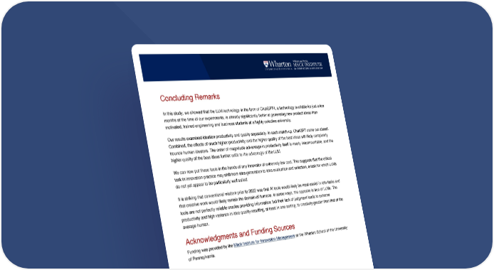 Concluding Remarks In this study, we showed that the LLM technology in the form of ChatGPT4, a technology available for just a few months at the time of our experiments, is already significantly better at generating new product ideas than motivated, trained engineering and business students at a highly selective university. Our results examined ideation productivity and quality separately. In each match-up, ChatGPT came out ahead. Combined, the effects of much higher productivity and the higher quality of the best ideas will likely completely trounce human ideators. The order of magnitude advantage in productivity itself is nearly insurmountable, and the higher quality of the best ideas further adds to the advantage of the LLM. We can now put these tools in the hands of any innovator at extremely low cost. This suggests that the critical task in innovation practice may shift from idea generation to idea evaluation and selection, a task for which LLMs do not yet appear to be particularly well suited. It is striking that conventional wisdom prior to 2022 was that AI tools would likely be most useful in rote tasks and that creative work would likely remain the domain of humans. In some ways, the opposite is true of LLMs. The tools are not perfectly reliable oracles providing information, but their lack of judgment leads to extreme productivity and high variance in idea quality resulting, at least in one setting, to creativity greater than that of the average human. Acknowledgments and Funding Sources Funding was provided by the Mack Institute for Innovation Management at the Wharton School of the University of Pennsylvania.