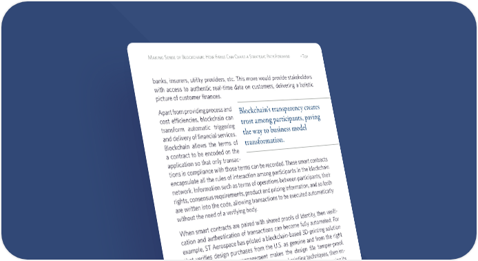 6 Making Sense of Blockchain: How Firms Can Chart a Strategic Path Forward ^Top banks, insurers, utility providers, etc. This move would provide stakeholders with access to authentic real-time data on customers, delivering a holistic picture of customer finances. Apart from providing process and cost efficiencies, blockchain can transform automatic triggering and delivery of financial services. Blockchain allows the terms of a contract to be encoded on the application so that only transac- tions in compliance with those terms can be recorded. These smart contracts encapsulate all the rules of interaction among participants in the blockchain network. Information such as terms of operations between participants, their rights, consensus requirements, product and pricing information, and so forth are written into the code, allowing transactions to be executed automatically without the need of a verifying body. When smart contracts are paired with shared proofs of identity, then verifi- cation and authentication of transactions can become fully automated. For example, ST Aerospace has piloted a blockchain-based 3D-printing solution that verifies design purchases from the U.S. as genuine and from the right source.5 Digital rights management makes the design file tamper-proof. Smart contracts identify the right materials and printing techniques, then im- mediately trigger printing on a 3D printer in ST’s Singapore facilities using its laser metal process. Similarly, the Federal Aviation Administration and other aviation agencies have a critical need to establish the provenance of aircraft parts. By digitizing this tracing process in a tamper-proof way, these agencies can save cost and time while ensuring better quality. Nasdaq has launched its own payment platform that verifies and executes trading transactions based on smart contracts. The platform also automates 5 Agam Shah, “Trust in the Supply Chain,” Mechanical Engineering Magazine, May 2018, 30-35. Blockchain's transparency creates trust among participants, paving the way to business model transformation.