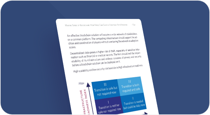 Making Sense of Blockchain: How Firms Can Chart a Strategic Path Forward ^Top An effective blockchain solution will require a wide network of stakeholders on a common platform. The computing infrastructure should support the ad- dition and coordination of players without overtaxing the network as adoption scales. Decentralized data poses a higher risk of theft, especially of sensitive infor- mation such as financial or medical records. The firm should test the impen- etrability of its infrastructure and address concerns of privacy and security before a blockchain solution can be deployed on it. High scalability and low security risk translate to high infrastructure readiness. IV Transition is both required and safe Low Infrastructure Readiness Index Interparty Transactions Index High Low High II Transition is needed but could be risky now III Transition is safe but not required now I Transition is neither safe nor required now The higher the IRI is, the smaller the risk of adopting blockchain is. The higher the ITI is, the greater the need for blockchain is.