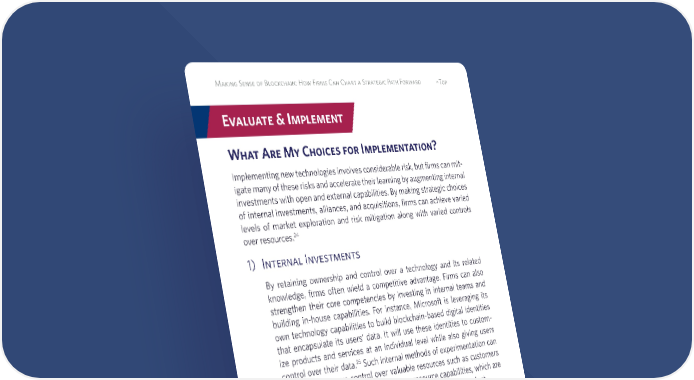 20 Making Sense of Blockchain: How Firms Can Chart a Strategic Path Forward ^Top Evaluate & Implement What Are My Choices for Implementation? Implementing new technologies involves considerable risk, but firms can mit- igate many of these risks and accelerate their learning by augmenting internal investments with open and external capabilities. By making strategic choices of internal investments, alliances, and acquisitions, firms can achieve varied levels of market exploration and risk mitigation along with varied controls over resources.24 1) Internal Investments By retaining ownership and control over a technology and its related knowledge, firms often wield a competitive advantage. Firms can also strengthen their core competencies by investing in internal teams and building in-house capabilities. For instance, Microsoft is leveraging its own technology capabilities to build blockchain-based digital identities that encapsulate its users’ data. It will use these identities to custom- ize products and services at an individual level while also giving users control over their data.25 Such internal methods of experimentation can help firms preserve control over valuable resources such as customers and data.26 They can also create human resource capabilities, which are particularly valuable given the dearth of existing blockchain talent. 24 Laurence Capron and Will Mitchell, Build, Borrow, or Buy (Boston, MA: Harvard Business Review Press, 2012). 25 Peggy Johnson, “Partnering for a Path to Digital Identity,” Microsoft (blog), January 22, 2018, https:// blogs.microsoft.com/blog/2018/01/22/partnering-for-a-path-to-digital-identity/. Ankur Patel, “Decentralized Digital Identities and Blockchain – The Future as We See It,” Microsoft (blog), February 12, 2018, https://cloudblogs.microsoft.com/enterprisemobility/2018/02/12/decentral- ized-digital-identities-and-blockchain-the-future-as-we-see-it/. 26 Capron and Mitchell, “When to Build: Internal Development Versus External Sourcing,” in Build, Borrow, or Buy, chap. 2.