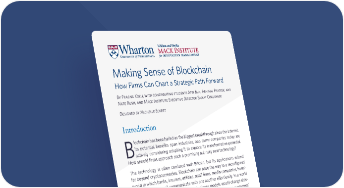 2 Making Sense of Blockchain How Firms Can Chart a Strategic Path Forward By Pragna Kolli, with contributing students Jitin Jain, Abhinav Prateek, and Nate Rush, and Mack Institute Executive Director Saikat Chaudhuri Designed by Michelle Eckert Introduction B lockchain has been hailed as the biggest breakthrough since the internet. Its potential benefits span industries, and many companies today are actively considering adopting it to explore its transformative potential. How should firms approach such a promising but risky new technology? The technology is often confused with Bitcoin, but its applications extend far beyond cryptocurrencies. Blockchain can pave the way to a reconfigured world in which banks, insurers, utilities, retail firms, media companies, hospi- tals, and law firms all communicate with one another effortlessly. In a world with widespread blockchain adoption, business models would change dras- tically: Utility firms would arrive on maintenance calls because customers’ smart home systems had triggered service delivery and already contacted the insurer and bank for payments. Retailers shipping products from remote villages across continents would clear border security and customs check- points in seconds, tracking the process every step of the way. Pharmaceutical companies would more easily trace drug ingredients to their source, vastly reducing the incidence of the counterfeit medicines that plague today’s sup- ply chain.