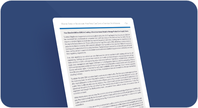 Making Sense of Blockchain: How Firms Can Chart a Strategic Path Forward ^Top How GlaxoSmithKline (GSK) Is Creating a Blockchain-based Model to Manage Product Line Supply Chains To detect illegitimate drug products and ensure patient safety, the U.S. Drug Supply Chain Security Act (DSCSA) has mandated that pharmaceutical companies track and trace drugs at the retail-unit level by 2023. The act requires a detailed digital record of who has handled the product and where, starting from the manufacturer all the way to the local pharmacist. This is a difficult task for large firms such as GSK, which have complex processes and wide distribution networks. GSK scientists looking for tracking solutions took cues from Walmart’s success in tracking pork products from China using blockchain. The technology’s immutability and time efficiency attracted them, so they set out in search of a blockchain-based solution to establish drug provenance irrefutably and meet their regulatory requirements. First, GSK identified a non-critical use case that would be safe to experiment with: tracking cell lines for cell engineering. Cell lines are cultures that scientists use to edit and study biological processes (genome editing). Some activities in GSK’s cell engineering value chain were inefficient. Specifically, multiple license verifications made stock management and request fulfillment at its BioRepository laborious and time-consuming. When a GSK scientist requested certain cell lines for experiments, the BioRepository needed time to verify the scientist’s license and access rights. It then had to verify stock availability before approving. Since it worked separately from the procurement team for stocking cell lines, replenishment time and demand time often got mismatched, resulting in delays. To initiate the pilot, GSK’s scientists had to work around certain hurdles. The first was to obtain approvals from the leadership team, for which they had to construct a sound business case. By citing Walmart’s success, and after much deliberation on the estimated dollar efficiency gains, they managed to persuade the leadership to run a pilot. Next, to alleviate data security concerns, they voted to build a private internal blockchain. To minimize operational disruptions for the rest of the firm, they involved only a limited number of stakeholders. Finally, they negotiated and brought the BioRepository team, procurement team, external vendors, and a sample team of scientists on board. While their business case was clear, the scientists did not have a working knowledge of blockchain. To fill this skill gap, they looked outside the firm for experts and hired Viant, an Ethereum-based blockchain platform. Viant built a pilot solution around GSK’s existing computing infrastructure instead of upgrading it in order to limit capital expenditure. Under the pilot solution, pre-written smart contracts verify a scientist’s license and validate permission instantly when he or she requests a cell line. The application simultaneously verifies data on stock availability at the BioRe- pository, triggers delivery to the scientist, and alerts the vendor when replacement and replenishment of cell lines is required. Payments happen automatically since both the vendor and its bank are on the blockchain. GSK can provide regulators with access if needed. As an added benefit, the cryptographical nature of the application allows stakeholders to access only the portions of the supply chain relevant to their business. For instance, a vendor can be granted access to just the freezer unit while other aspects of the cell engineering process remain inaccessible. GSK’s pilot has yielded a holistic cell line tracking system that enables cost and time efficiencies as well as secure data sharing. By replicating this program to drug products with a larger volume of stakeholders, GSK would be able to fulfill the DSCSA’s tracing mandate. Furthermore, since license ownership can be easily traced, GSK can share its experimental research with its scientists all over the world without risking misuse of information. Following improvements in the healthcare data ecosystem, GSK is planning to extend this experiment to enable secure data exchange among researchers, patients, and clinical research centers. It plans to continue monitoring market adoption for blockchain and envisions solutions for managing pharmacogenomic data for clinical studies, patient enrollment, trial monitoring, managing consent, and more.