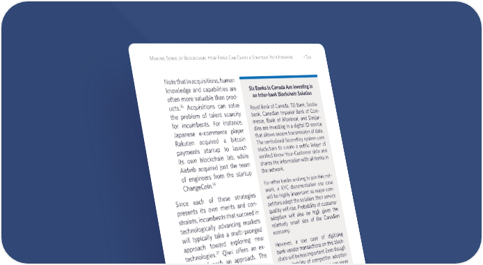 Making Sense of Blockchain: How Firms Can Chart a Strategic Path Forward ^Top Note that in acquisitions, human knowledge and capabilities are often more valuable than prod- ucts.35 Acquisitions can solve the problem of talent scarcity for incumbents. For instance, Japanese e-commerce player Rakuten acquired a bitcoin payments startup to launch its own blockchain lab, while Airbnb acquired just the team of engineers from the startup ChangeCoin.36 Since each of these strategies presents its own merits and con- straints, incumbents that succeed in technologically advancing markets will typically take a multi-pronged approach toward exploring new technologies.37 Qiwi offers an ex- ample of such an approach. The 35 Saikat Chaudhuri and Behnam Tabrizi, “Capturing the Real Value in High-Tech Acquisi- tions,” Harvard Business Review, September-Oc- tober, 1999, https://hbr.org/1999/09/captur- ing-the-real-value-in-high-tech-acquisitions. 36 Biz Carson, “Airbnb just brought on a team of bitcoin experts from a tiny startup,” Business Insider, April 12, 2016, http://www.businessin- sider.com/airbnb-buys-bitcoin-startup-change- coin-2016-4. 37 Capron and Mitchell, “Developing Your Enterprise Selection Capability: The Balance Imperative,” in Build, Borrow, or Buy, chap. 7. Six Banks in Canada Are Investing in an Inter-bank Blockchain Solution Royal Bank of Canada, TD Bank, Scotia- bank, Canadian Imperial Bank of Com- merce, Bank of Montreal, and Desjar- dins are investing in a digital ID service that allows secure transmission of data. The centralized SecureKey system uses blockchain to create a public ledger of verified Know-Your-Customer data and shares the information with all banks in the network. For other banks wishing to join this net- work, a KYC-documentation use case will be highly important: as major com- petitors adopt the solution, their service quality will rise. Probability of customer adoption will also be high given the relatively small size of the Canadian economy. However, a use case of digitizing bank-vendor transactions on this block- chain will be less important. Even though the probability of competitor adoption is high, existing technologies can serve vendor transactions well enough that relationships will not be adversely af- fected. Moreover, competitor adoption might not necessarily impact firm-ven- dor relationships in any significant way.