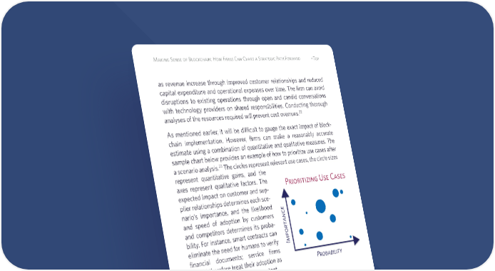 19 Making Sense of Blockchain: How Firms Can Chart a Strategic Path Forward ^Top as revenue increase through improved customer relationships and reduced capital expenditure and operational expenses over time. The firm can avoid disruptions to existing operations through open and candid conversations with technology providers on shared responsibilities. Conducting thorough analyses of the resources required will prevent cost overruns.22 As mentioned earlier, it will be difficult to gauge the exact impact of block- chain implementation. However, firms can make a reasonably accurate estimate using a combination of quantitative and qualitative measures. The sample chart below provides an example of how to prioritize use cases after a scenario analysis.23 The circles represent relevant use cases, the circle sizes represent quantitative gains, and the axes represent qualitative factors. The expected impact on customer and sup- plier relationships determines each sce- nario’s importance, and the likelihood and speed of adoption by customers and competitors determines its proba- bility. For instance, smart contracts can eliminate the need for humans to verify financial documents; service firms should therefore treat their adoption as highly probable and highly important. 22 Interviews with technology firms supporting blockchain implementation, April 2018. 23 Schoemaker and Mavaddat, “Scenario Planning,” in Day, Schoemaker, and Gunther, Wharton on Emerging Technologies, chap. 10. Prioritizing Use Cases Probability Importance