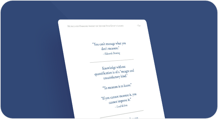 2 Metrics for Managing Innovation: Lessons From Growth Leaders ^Top “You can’t manage what you don’t measure.” – Edwards Deming Knowledge without quantification is of a “meagre and unsatisfactory kind.” “To measure is to know.” “If you cannot measure it, you cannot improve it.” – Lord Kelvin “Not everything that can be measured is important and not everything that is important can be measured.”1 – Albert Einstein 1 Donald R. Lehman and David J. Reibstein, Marketing Metrics and Financial Performance, Cambridge MA: Marketing Science Institute, 2006.