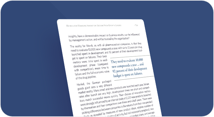28 Metrics for Managing Innovation: Lessons From Growth Leaders ^Top insights, have a demonstrable impact on business results, can be influenced by management action, and will be trusted by the organization? The reality for Merck, as with all pharmaceutical companies, is that they need to evaluate 10,000 new compounds a year, with six to 12 years per drug launched spent in development, and 92 percent of their development bud- get is spent on failures. Their best metrics were: time spent in each development phase (compared with competition), mean time to failure and the full economic value of the drug pipeline. Henkel, the German packaged goods giant sees a very different market reality. Many small and new products are launched each year, failure rates after launch are very high, development times are short and compet- itors match successful moves quickly. Their choices of innovation metrics were strongly influenced by an internal study of 2,237 new products launched by themselves and four competitors over three and a half years. There were striking differences between companies in the returns from their new product efforts as revealed by measures of new product share, relative number of launches (actually an indicator of activity, but not necessarily progress), new product launches that gained more than 1 percent market share, and average brand share change, which showed whether new products were building share or just replacing their existing products. The innovation metrics dashboard is also a part of a firm’s overall dashboard of performance metrics, reflecting their strategic priorities and organizational imperatives. For example, Mack Institute partner JPMorgan Chase has HR metrics to assess their ability to attract and retain talent and promote an innovative mindset. One is JPMorgan Chase’s App Store rating, which is among the highest of all banks. Another metric is the extent to which senior They need to evaluate 10,000 new compounds a year … and 92 percent of their development budget is spent on failures.