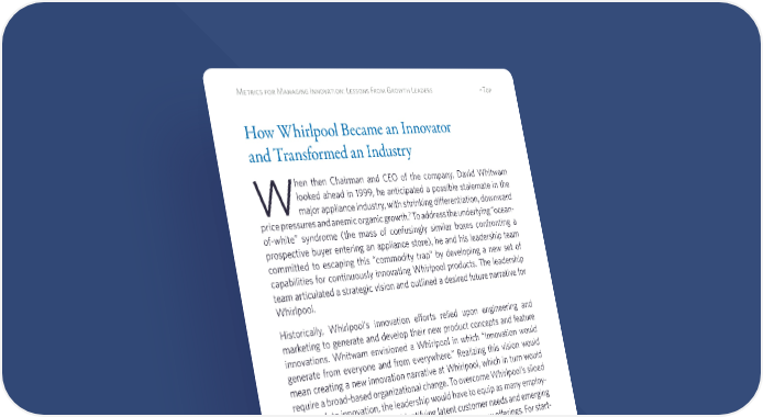 6 Metrics for Managing Innovation: Lessons From Growth Leaders ^Top How Whirlpool Became an Innovator and Transformed an Industry W hen then Chairman and CEO of the company, David Whitwam looked ahead in 1999, he anticipated a possible stalemate in the major appliance industry, with shrinking differentiation, downward price pressures and anemic organic growth.7 To address the underlying “ocean- of-white” syndrome (the mass of confusingly similar boxes confronting a prospective buyer entering an appliance store), he and his leadership team committed to escaping this “commodity trap” by developing a new set of capabilities for continuously innovating Whirlpool products. The leadership team articulated a strategic vision and outlined a desired future narrative for Whirlpool. Historically, Whirlpool’s innovation efforts relied upon engineering and marketing to generate and develop their new product concepts and feature innovations. Whitwam envisioned a Whirlpool in which “Innovation would generate from everyone and from everywhere.” Realizing this vision would mean creating a new innovation narrative at Whirlpool, which in turn would require a broad-based organizational change. To overcome Whirlpool’s siloed approach to innovation, the leadership would have to equip as many employ- ees as possible with tools for identifying latent customer needs and emerging technologies, and then combine them into innovative new offerings. For start- ers, ideas were solicited from all of Whirlpool’s 61,000 employees. Whirlpool created a set of metrics that were distributed throughout the com- pany and included an emphasis on the innovation goal of a $1 billion addition 7 The Whirlpool change process is described in J.W. Rivkin, D. Leonard, and G. Hamel, “Change at Whirlpool Corporation (B),” Harvard Business School case 9-705-463, (March 2006): N. T. Snyder and Dr. I., Duarte Unleashing Innovation: How Whirlpool Transformed an Industry, (New York: Jossey-Bass 2008); G. Hamel and N. Tennant, “The 5 Requirements of a Truly Innovative Company,” Harvard Business Review, (April 27, 2015), and D. Dependable Results,” Business Strategy Series, 10/2 (2009).
