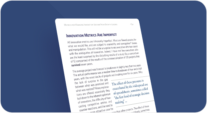 13 Metrics for Managing Innovation: Lessons From Growth Leaders ^Top Innovation Metrics Are Imperfect All innovation metrics are inherently imperfect. Most are flawed proxies for what we would like, and are subject to availability and surrogation11 biases and manipulation. This will not be a surprise to any executive who has coped with the ambiguities of innovation. Indeed, I have met few executives who are the least surprised by the disturbing results of a study (by a consortium of 12 companies) of the results of the commercialization of 120 projects that survived seven years. The average project was forecast to break even in slightly less than two years. The actual performance was a median time-to-breakeven of four and a half years, with the worst decile of projects not breaking even for six years. Why the lack of surprise in the gap between what was promised and what was realized? Many explana- tions are offered; essentially they boil down to the inherent optimism of innovators, the difficulty of fore- casting competitive entries and counter-reactions, and the need to present a more attractive case for a share of scarce company resources than other projects. The effect of these pressures is exacerbated by the widespread use of spreadsheets, sometimes called “the fast food of strategic decision making” that enable analysts to build and manipulate financial forecasts. As Scott Cook12, the founder and Executive Chairman of Intuit, argues, a focus on financial rewards too early in the development process leads to a “withering 11 Michael Harris and Bill Taylor, “Don’t Let Metrics Undermine Your Business,” Harvard Business Review (September – October 2019), 63-69. 12 These quotations come from Clayton M. Christensen and Derek van Beur, “The Capitalist's Dilem- ma,” Harvard Business Review (June 2014), 62-68. The effect of these pressures is exacerbated by the widespread use of spreadsheets, sometimes called "the fast food of strategic decision making" …